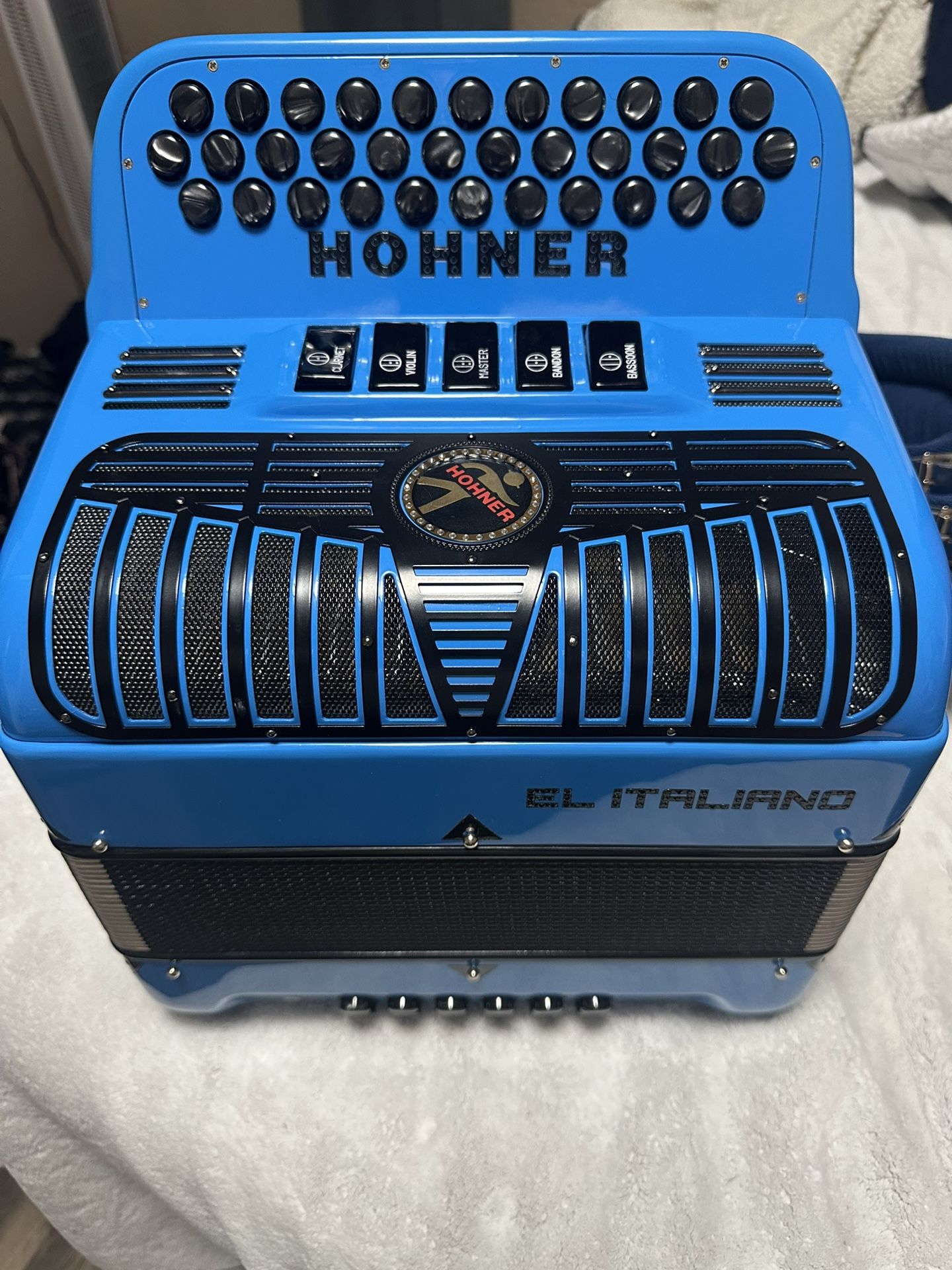 Hohner El Italiano Specs Buttons: 34 Treble Buttons, 12 Bass Buttons Button rows: 3 Class: Diatonic Voices: Chorus: LMM (3 Reeds) Keys: FBbEb Size: 13,7 x 7,5 Weight: 12 Lbs Reed plate quality: Manetti Straps: Italian Leather Straps In Blue Color Case: Plush case I’m open to negotiate
