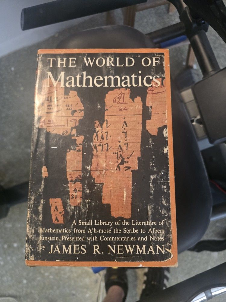 The World of Mathematics – 3‑Volume Set (1956) – $60 OBO Classic 3‑volume hardcover set edited by James R. Newman. A foundational collection of mathematical writing from ancient to modern thinkers. Great for collectors, teachers, students, or anyone who loves math history. Details - Complete 3‑volume set - 1956 edition - Hardcover - Includes commentary and historical notes - Out of print and highly respected Condition Fair condition — covers show wear, edges are frayed, and some aging is visible, but all pages are intact and readable. A solid, usable set for study or display. Price $60 or best offer Open to reasonable offers. Pickup in Phoenix.