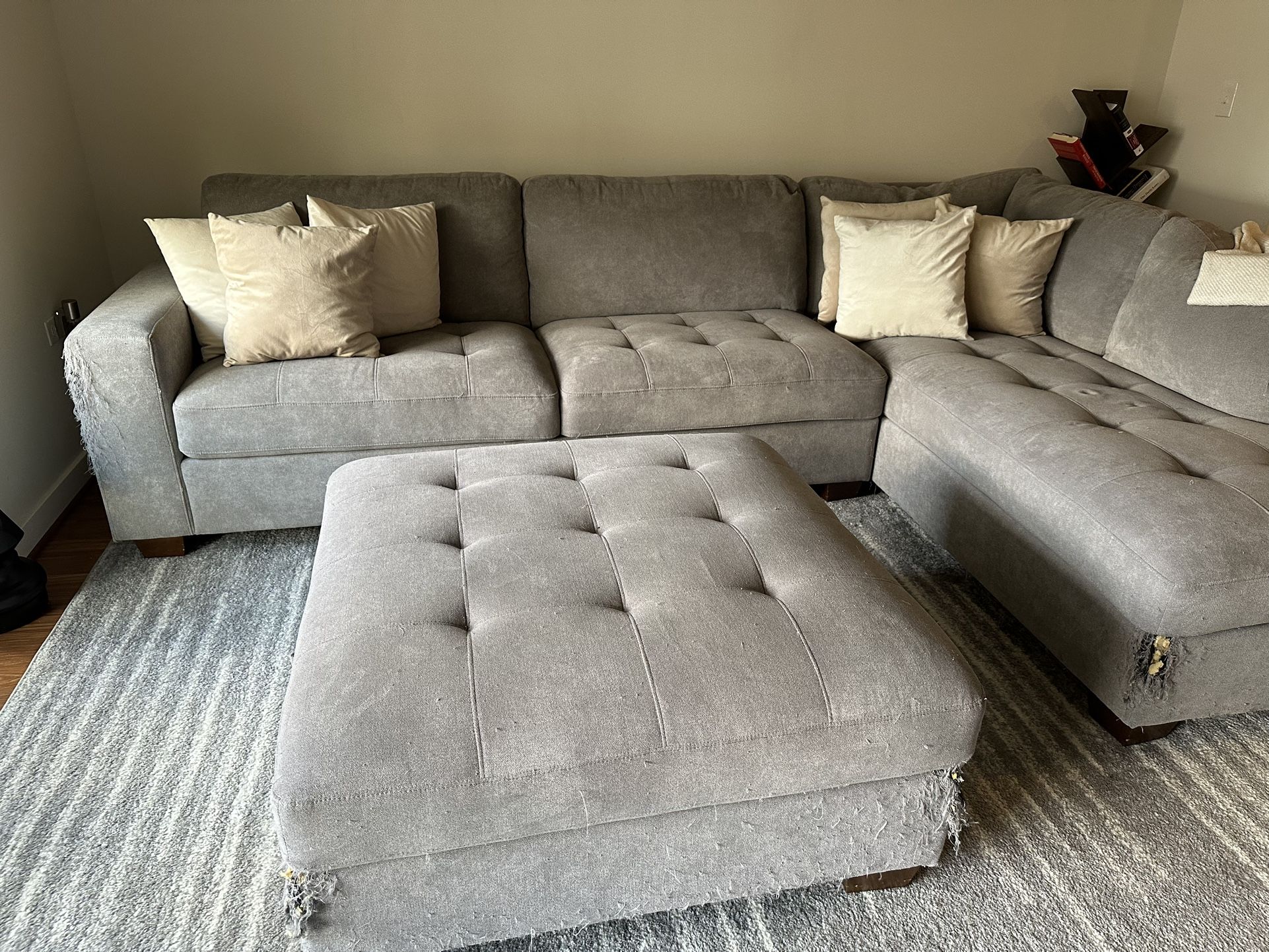 Purchased on Costco website Scratches on corners (showed in pictures) Very comfortable comes with pillows Ottoman has storage inside Dimensions: 7ft 3in x 10ft 3in