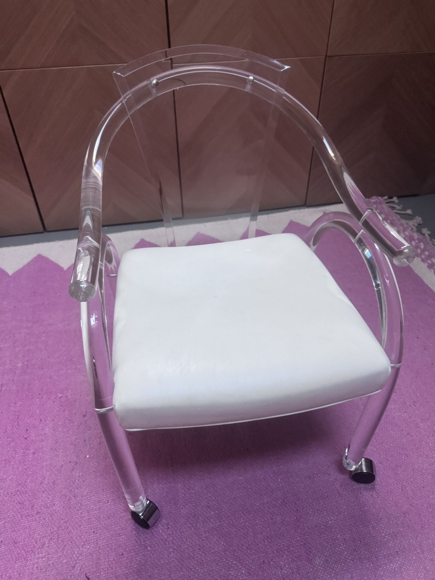 Vintage lucite & vinyl armchairs with curving back and frame. This gorgeous MCM piece is designed in transparent lucite with a white square vinyl seat. The armed framework is capped with casters making this a versatile & easy-to-move chair. Flawless condition. Looks just like Charles Hollis Jones - which go for $1,600 or more. $250 each or $400 for both. Furniture designer to the stars Charles Hollis Jones pioneered the use of acrylic and Lucite in his designs beginning the 1960s, the golden age of plastics. Measurements: Seat: 19" Deep, 18" wide Chair Back: 32.5 " from floor Arms: 24" in height