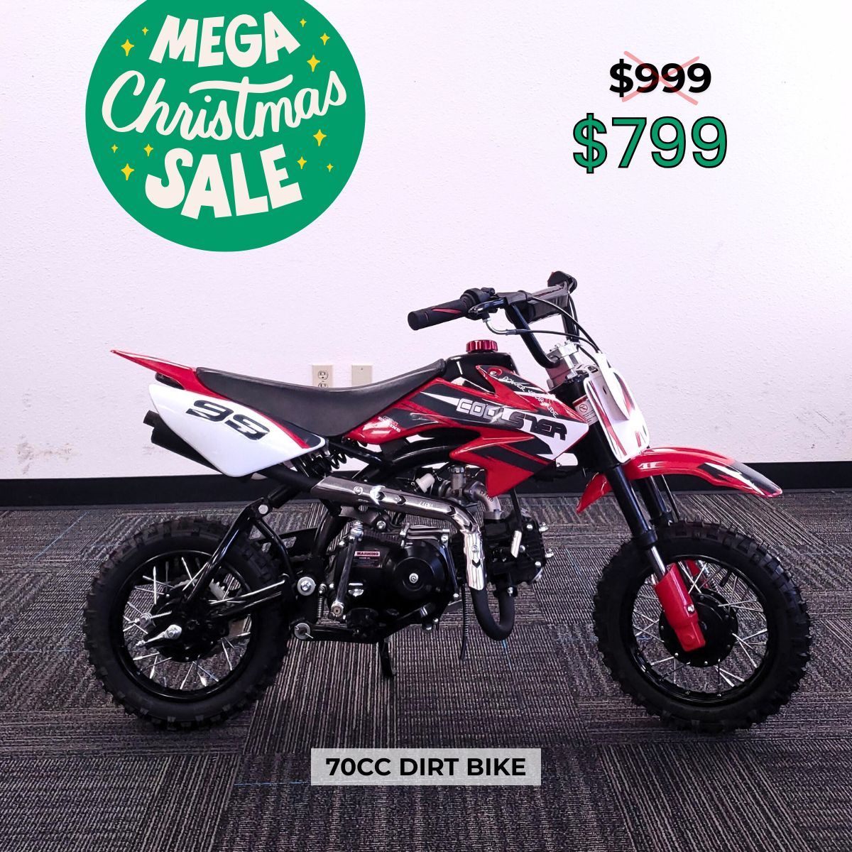 DIRT BIKE SALE! Beginner 70cc Semi-Auto! $200 OFF! ONLY $799! Time to hit the trails! Our Christmas Sale is live, and we’re dropping the price on this awesome Coolster QG210 70cc Dirt Bike! This is the perfect beginner bike for learning how to shift—it's semi-automatic (no clutch needed!) and can hit speeds up to 30 mph. Originally $999, our instant $200 OFF sale price makes it an unbelievable $799! It comes fully assembled in cool colors like Red or Blue. BIG SAVINGS TIP: Buy this dirt bike plus any other unit (ATV, scooter) and save up to $500 total! Plus, all riding gear is 25% OFF during the sale. Come check out this affordable, ready-to-ride dirt bike at our Sacramento shop today! Local, in-person sale only. During our Christmas Sale, we are open every day from today through Christmas Eve, including weekends, from 10:00 AM to 6:00 PM. Please feel free to stop by anytime—we look forward to seeing you at Sacramento ATV Motors. ✅Keywords dirt bike for sale, cheap dirt bike, 125cc dirt bike, 250cc dirt bike, kids dirt bike, beginner dirt bike, off road dirt bike, trail dirt bike, best dirt bike 2025, youth dirt bike for sale, dirt bike for birthday gift, Sacramento, Placer, Yolo, El Dorado, Sutter, Yuba, San Joaquin, Solano, Elk Grove, Citrus Heights, Folsom, Rancho Cordova, Galt, Isleton, Placer County, Roseville, Rocklin, Lincoln, Auburn, Loomis, Colfax, Yolo County, Davis, West Sacramento, Woodland, Winters, El Dorado County, Placerville, South Lake Tahoe, Sutter County,, Yuba City, Live Oak, Yuba County, Marysville, Wheatland, San Joaquin County, Stockton, Tracy, Lodi, Manteca, Ripon, Lathrop, Escalon, Solano County, Fairfield, Vacaville, Vallejo, Suisun City, Benicia, Dixon, Rio Vista