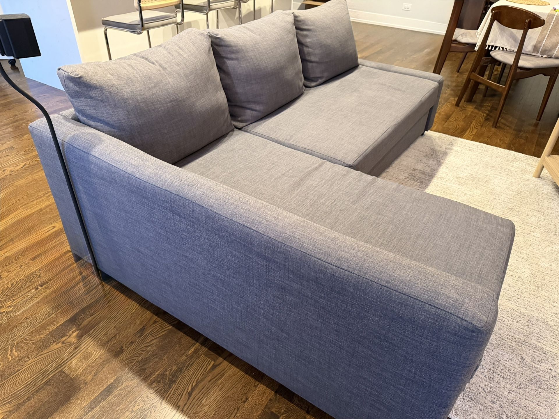 Selling my gray IKEA Friheten sofa bed. It’s in great shape, from a smoke-free, pet-free home. The chaise opens up for plenty of hidden storage (see photo), and the back folds down easily to turn into a full-size bed — perfect for guests or small apartments. Details: • Color: Dark gray • Condition: Gently used • Storage compartment under chaise • Converts into a full-size bed • Dimensions (approx.): 90½” x 59½” Asking $350 OBO (retails for about $1,000 new at IKEA). Pickup only — located near North Center. Message me if you’re interested or want to come take a look!