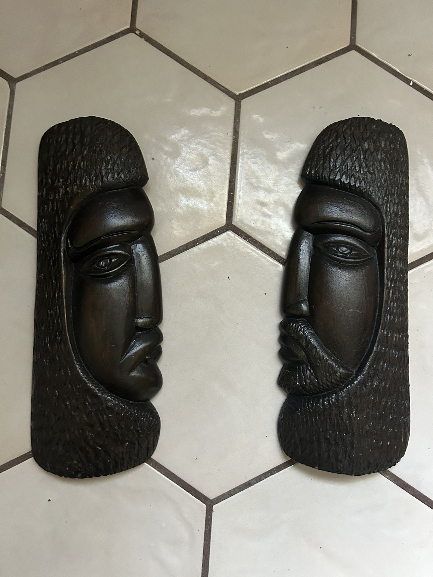 Set Of 2 Vintage Hand Carved Wooden Head Tribal Folk Decor