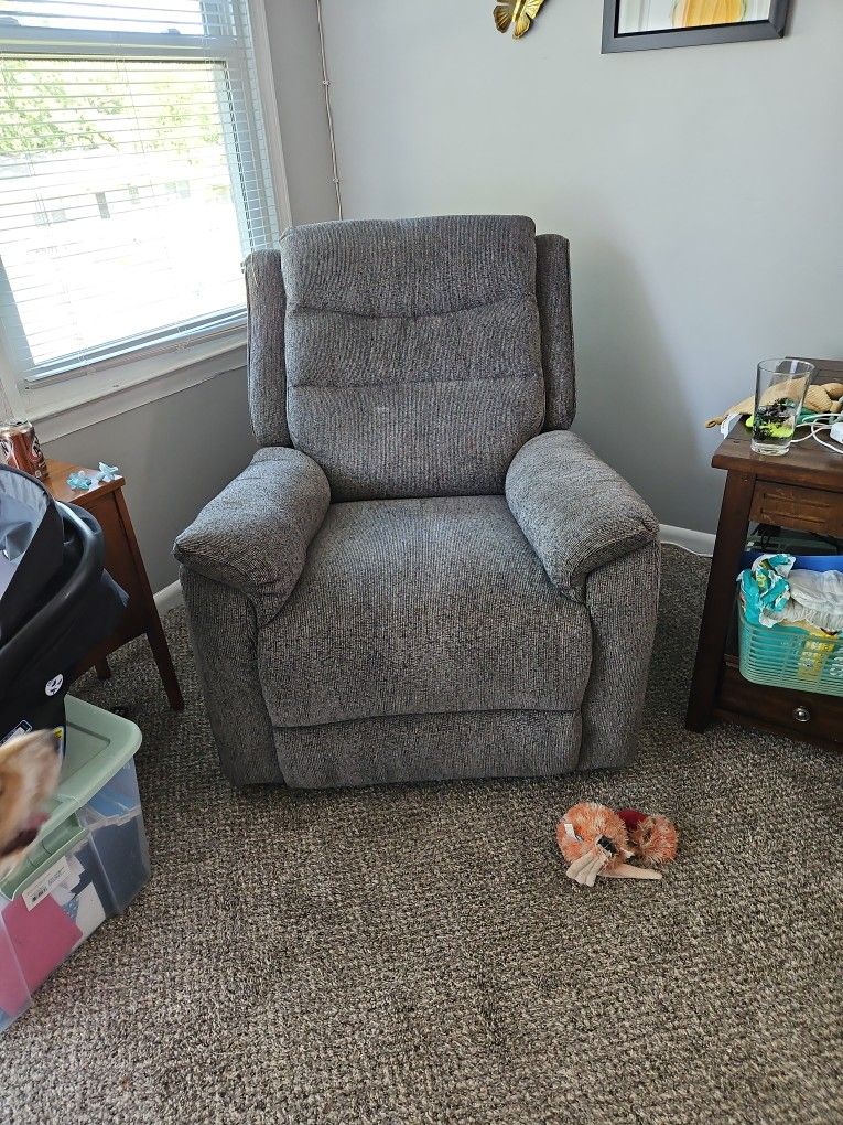 Gray Recliner Rock8ng Chair Gray 3 seat couch with recliners on each end 1 year old.
