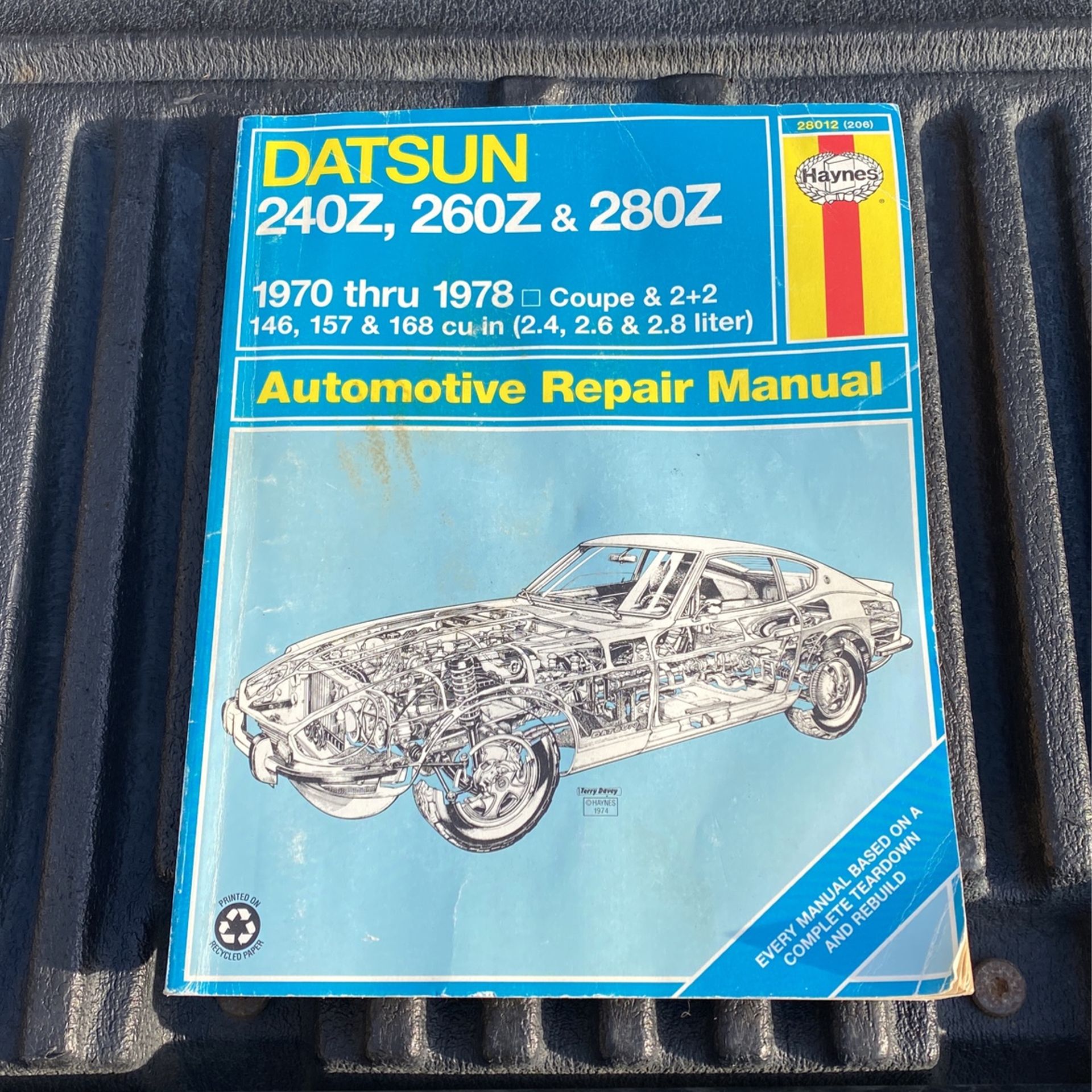 Datsun Z cars repair manual. Haynes 28012 Vintage. If you own a Zcar 240,260 or 280 you gotta have this. Yes you can more than likely find what you need on the internet but what fun is that when you can have a piece of history in the garage you are working in that houses one of these cool cars of a generation that has faded and now come back.
