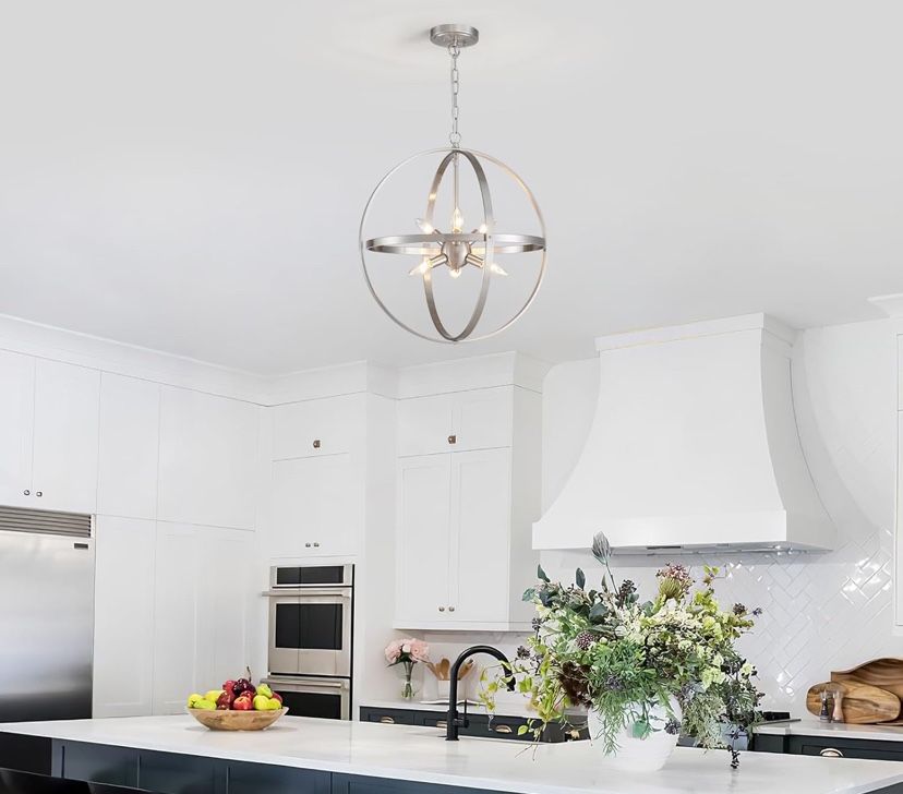 Brushed Nickel Orb Chandelier | 6-Light Globe Pendant Light | Sputnik Sphere Hanging Ceiling Light A timeless orb chandelier in brushed nickel — three intersecting metal rings form a globe frame around 6 candelabra-style lights. Clean, versatile, and works in virtually any interior. Fixture Highlights: ∙ Brushed nickel metal orb/globe frame with 3 intersecting rings ∙ 6 candelabra E12 sockets (40W max each) ∙ Adjustable hanging chain for custom drop height ∙ Sloped ceiling adaptor included — works on vaulted ceilings ∙ Pairs beautifully with Edison or flame-tip bulbs Why You’ll Love It: The orb chandelier is one of those rare designs that looks equally at home in a farmhouse kitchen, a transitional dining room, and a coastal-inspired space. The brushed nickel finish is the most universally compatible metal finish in home décor — it plays well with stainless appliances, chrome fixtures, and even warm metals.
