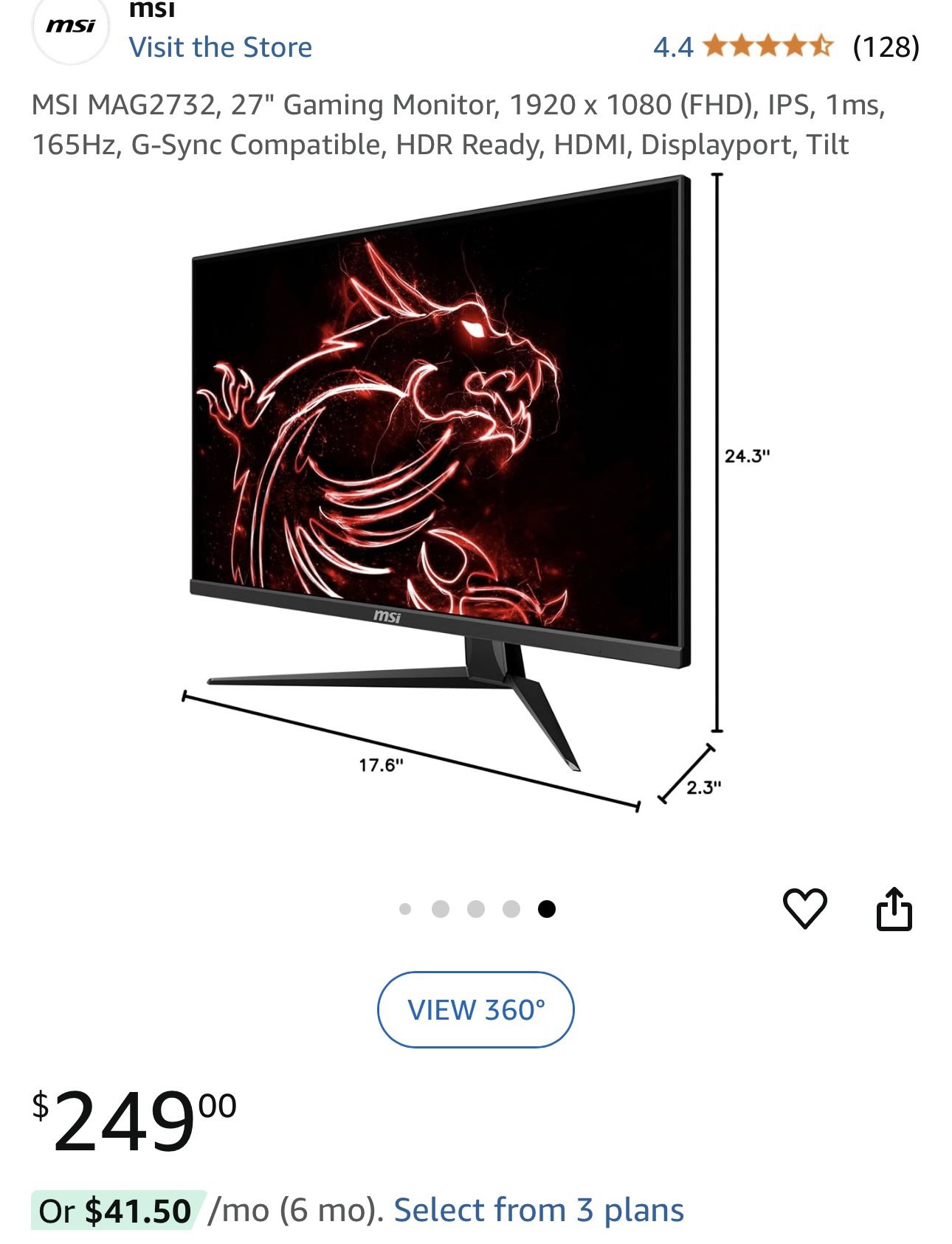 MSI MAG2732, 27" Gaming Monitor, 1920 x 1080 (FHD), IPS, 1ms, 165Hz, G-Sync Compatible, HDR Ready, HDMI, Displayport, Tilt