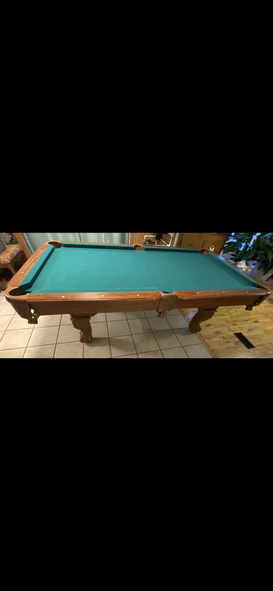 8’ pool table and accessories for sale. Some dings in felt as pictured. You disassemble and haul. There is no name plate and it is not slate.