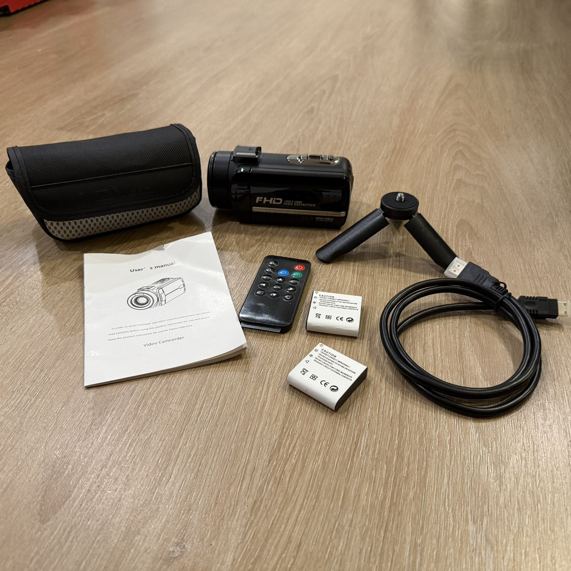 Fully functional HD camcorder bundle, great for beginners, kids, or casual video recording. Features: - Full HD 1080P video recording - 24MP photo resolution - 16X digital zoom - Flip screen (easy for vlogging/self recording) Includes: - Camcorder - 2 rechargeable batteries - USB charging cable - Mini tripod - Remote control - Carrying case - User manual Condition: Good, tested and working Minor cosmetic wear from normal use. Great as a starter camera, backup device, or for kids learning photography.