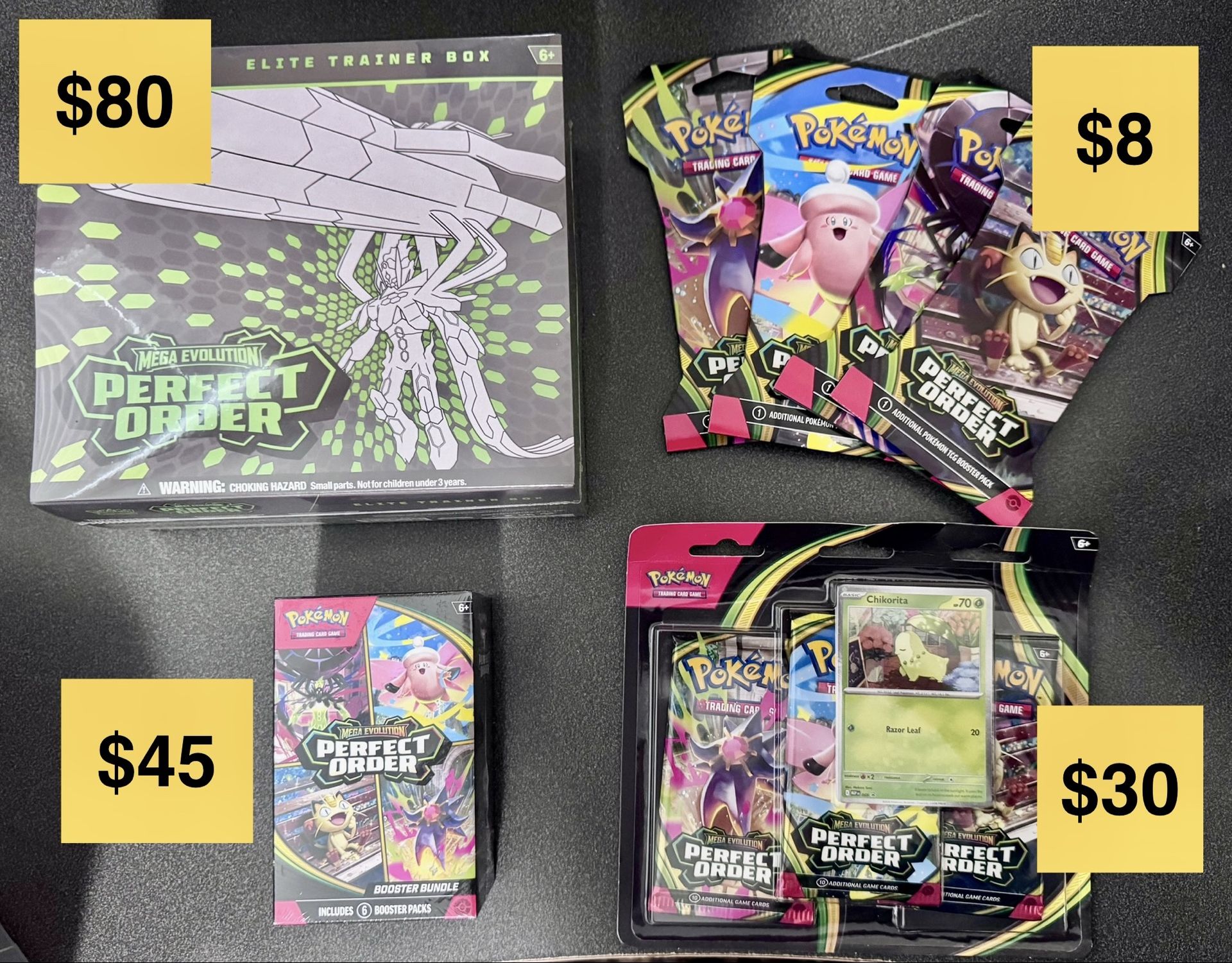 Selling the new Pokemon set - Perfect Order card items Have multiple of each items , just let me know what you are looking for . Elite Trainer Box - $80 - comes with 9 booster packs - a promo card - card divider, dice, and other TCG accessories Booster bundle - $45 - comes with 6 booster packs Triple Blister pack - $30 - comes with 3 booster packs - promo card Single sleeved booster packs - $8 - 4 different art sets with 1 booster pack Looking for cash or Zelle Not really looking for trades Meet in league city Webster area