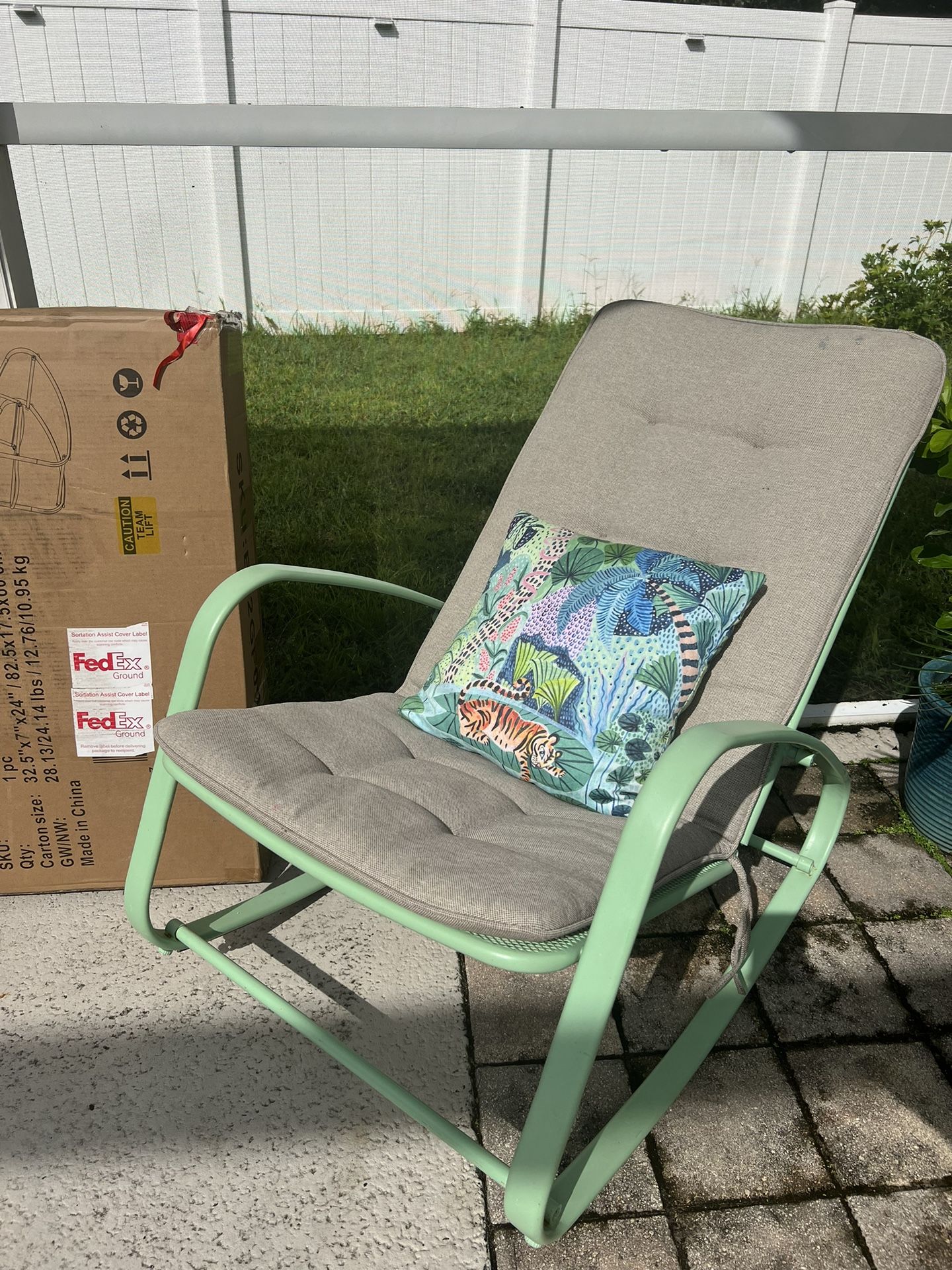 PHI VILLA Green Metal Outdoor Rocking Chair with Gray Cushions Green E-coated Steel Frame See the dimensions in the picture. This beautiful Society6 cushion for free (see a picture)