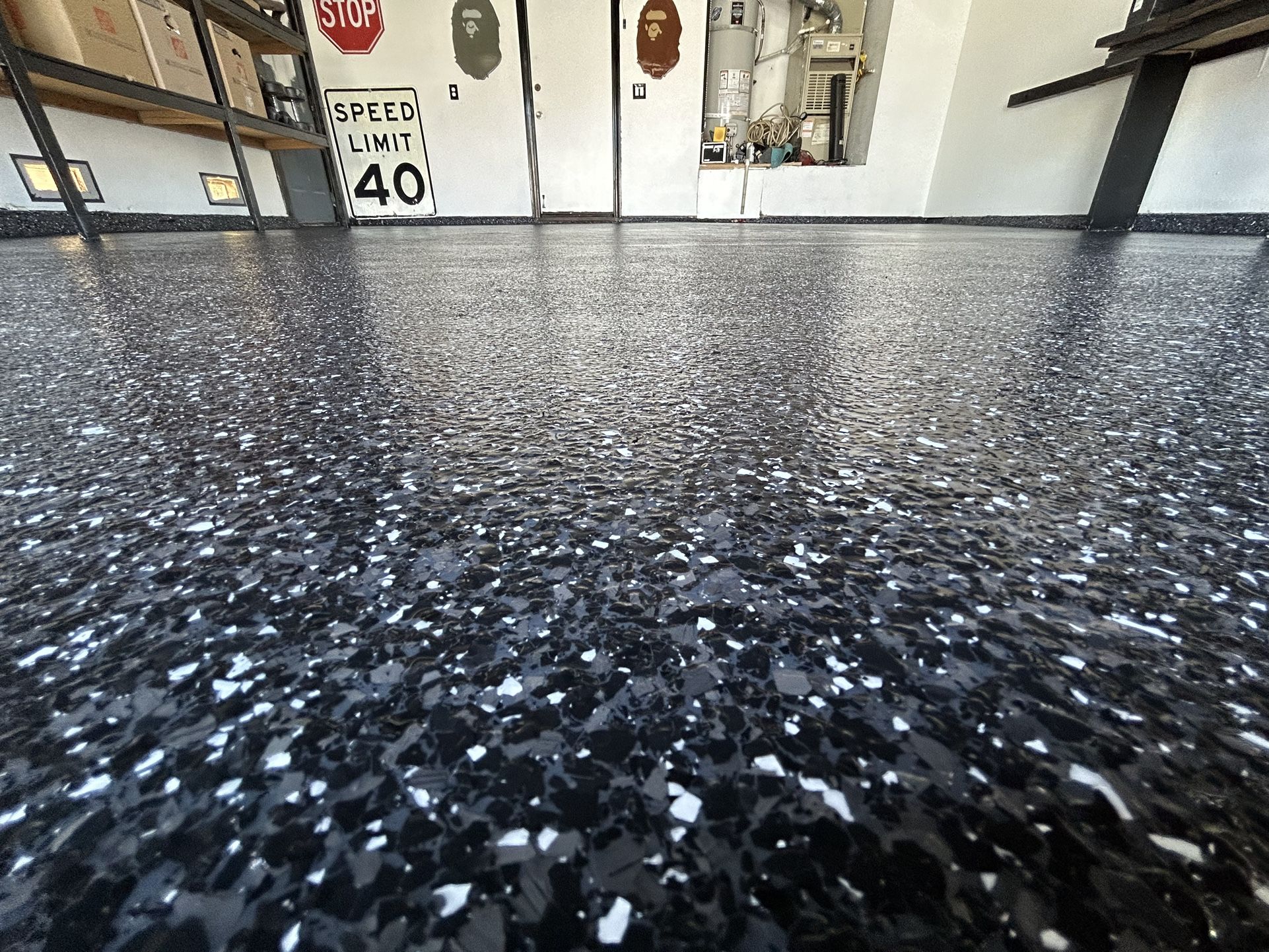 3 part high quality epoxy flake system includes 1-Epoxy base coat 2-layer of heavy duty chips 3-Clear coat of Poly aspartic -Easy to clean -Hygienic -Waterproof -Chemical,Heat,Shock,& Oil -25 Colors Available