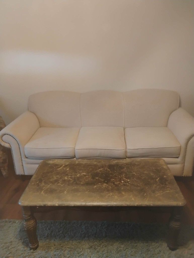 Full size bedroom suite and small living room furniture and lots of dishes and home decor