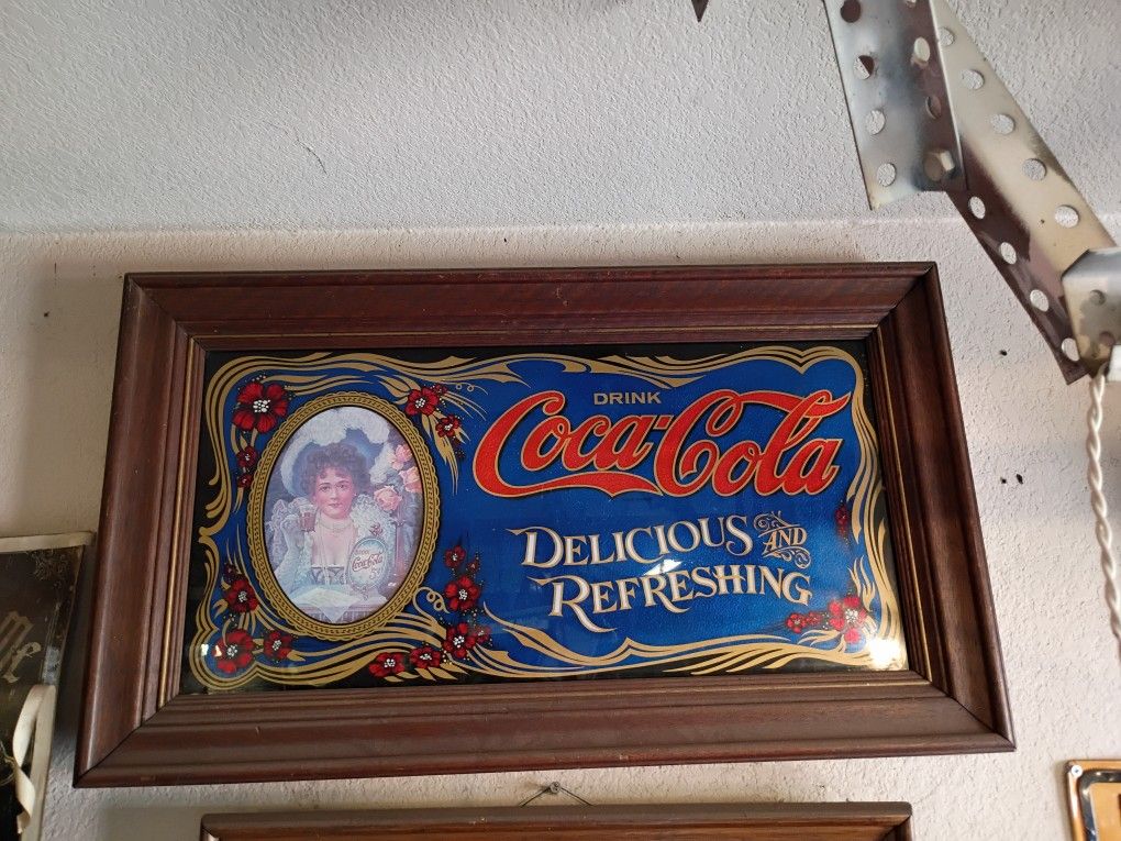 The mirror is a vintage Coca-Cola advertisement mirror with the slogan "Drink Coca-Cola Delicious and Refreshing". The oval portrait on the left side of the mirror is a depiction of a Victorian lady, and this type of mirror is a popular collectible. While the "Delicious and Refreshing" slogan was used by Coca-Cola as early as 1904, mirrors with this slogan and imagery were often reproduced in the 1970s and 1980s