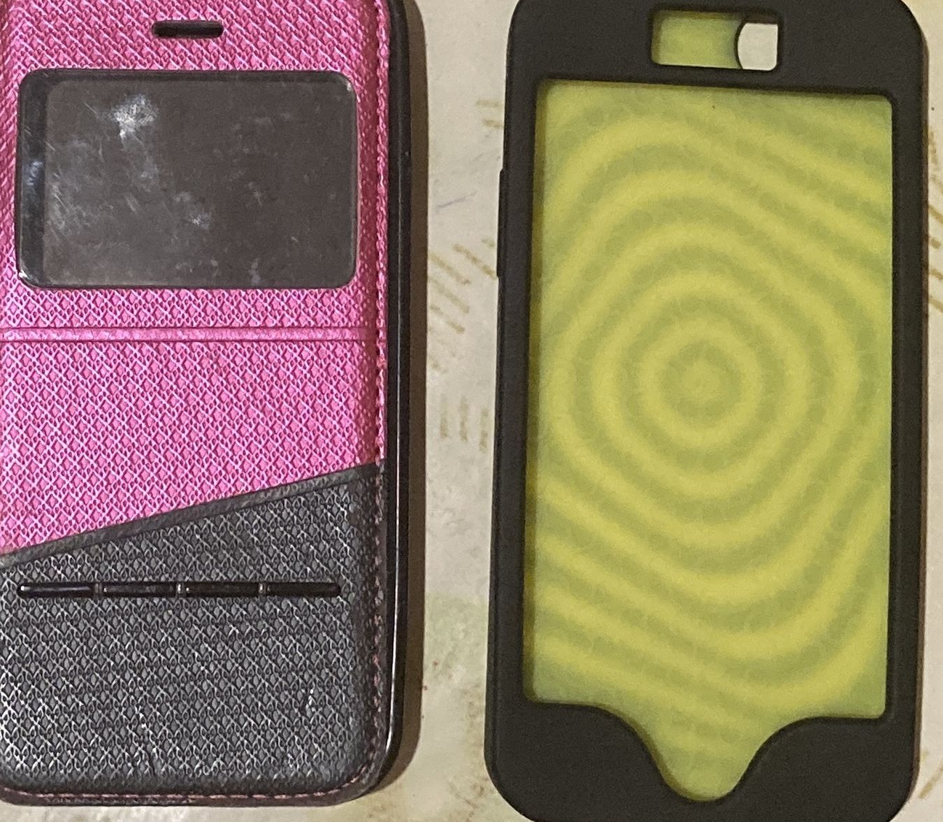 Iluv brand IPhone 5 case. Glows in the dark. Silicone case. Fits well. Hot pink with black IPhone 5 case wallet. Smart view case. Can answer phone with wallet closed. See who’s calling without opening the case. $5 for both