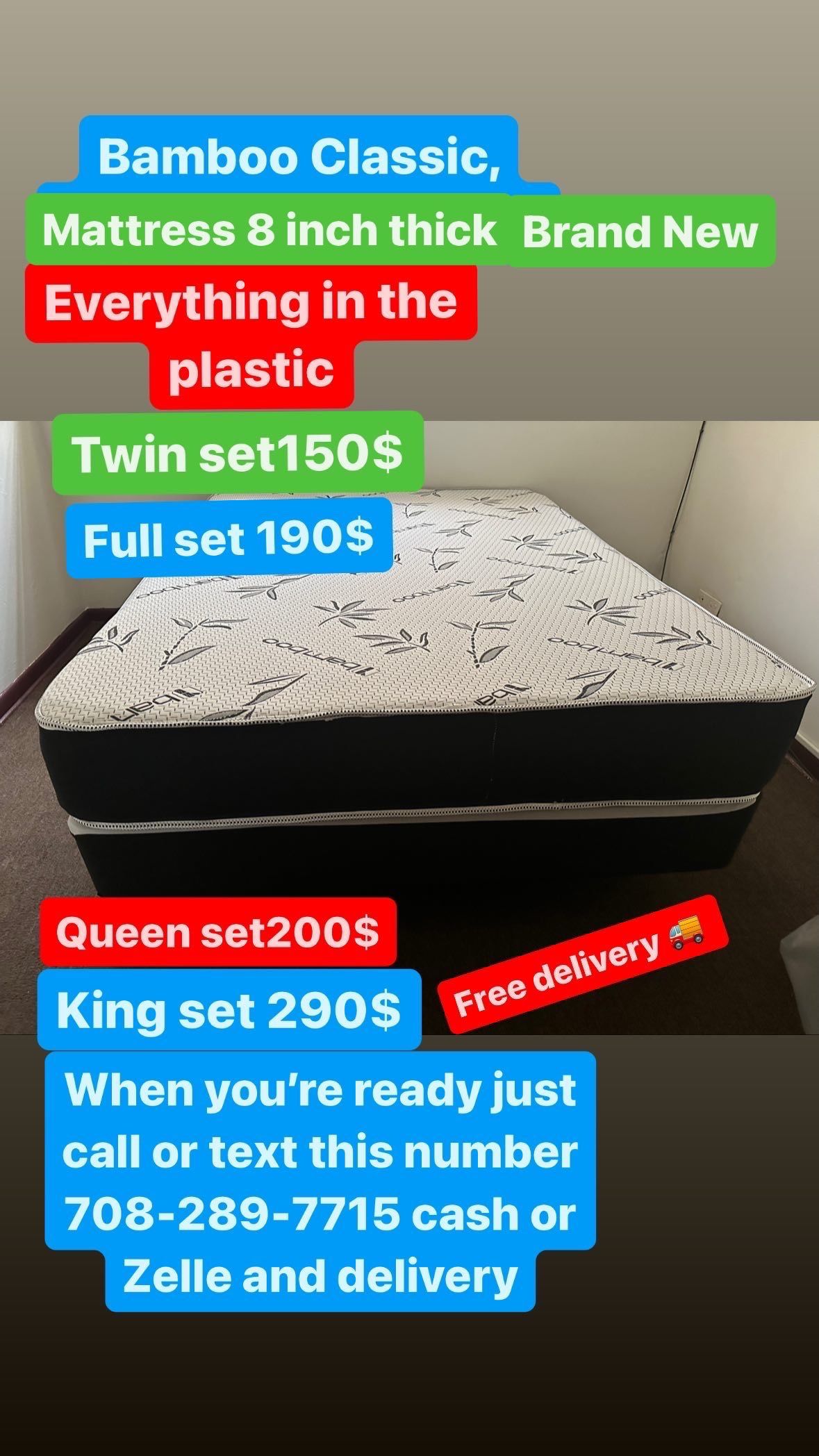 Huge sale for Mattress And Box Twin size mattress and box 150.$ full 190$ Queen 200$ king 290$. free delivery free set up 708….280….7715… cash or Zell