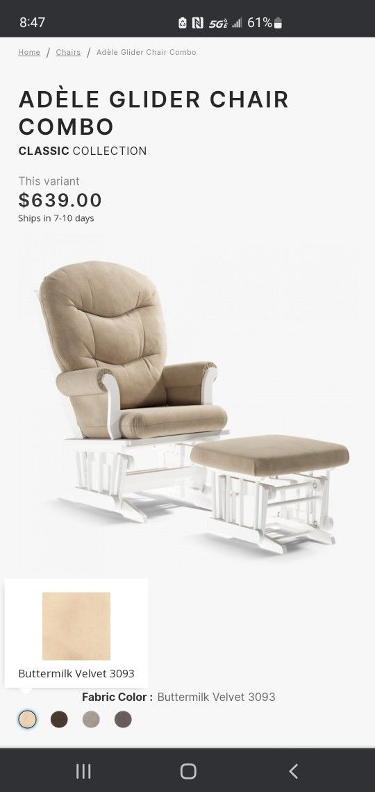 White wood rocker with beige cleanable fabric with ottoman. Hardly used. Reclines far back. Also has a lock to lock it in place. Very comfortable.