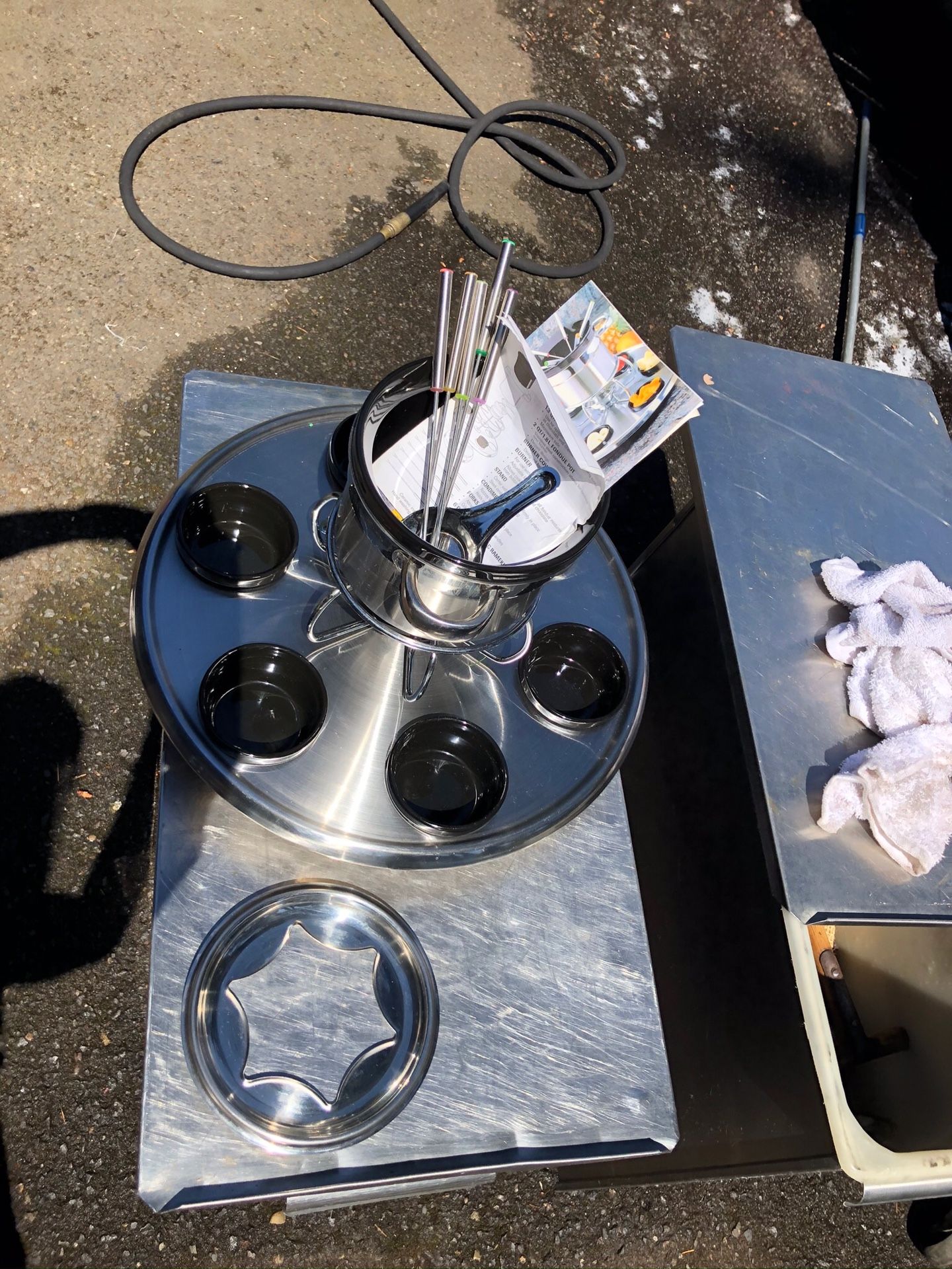 Stainless steel fondue set. Never used. Has all pieces. And it spins.