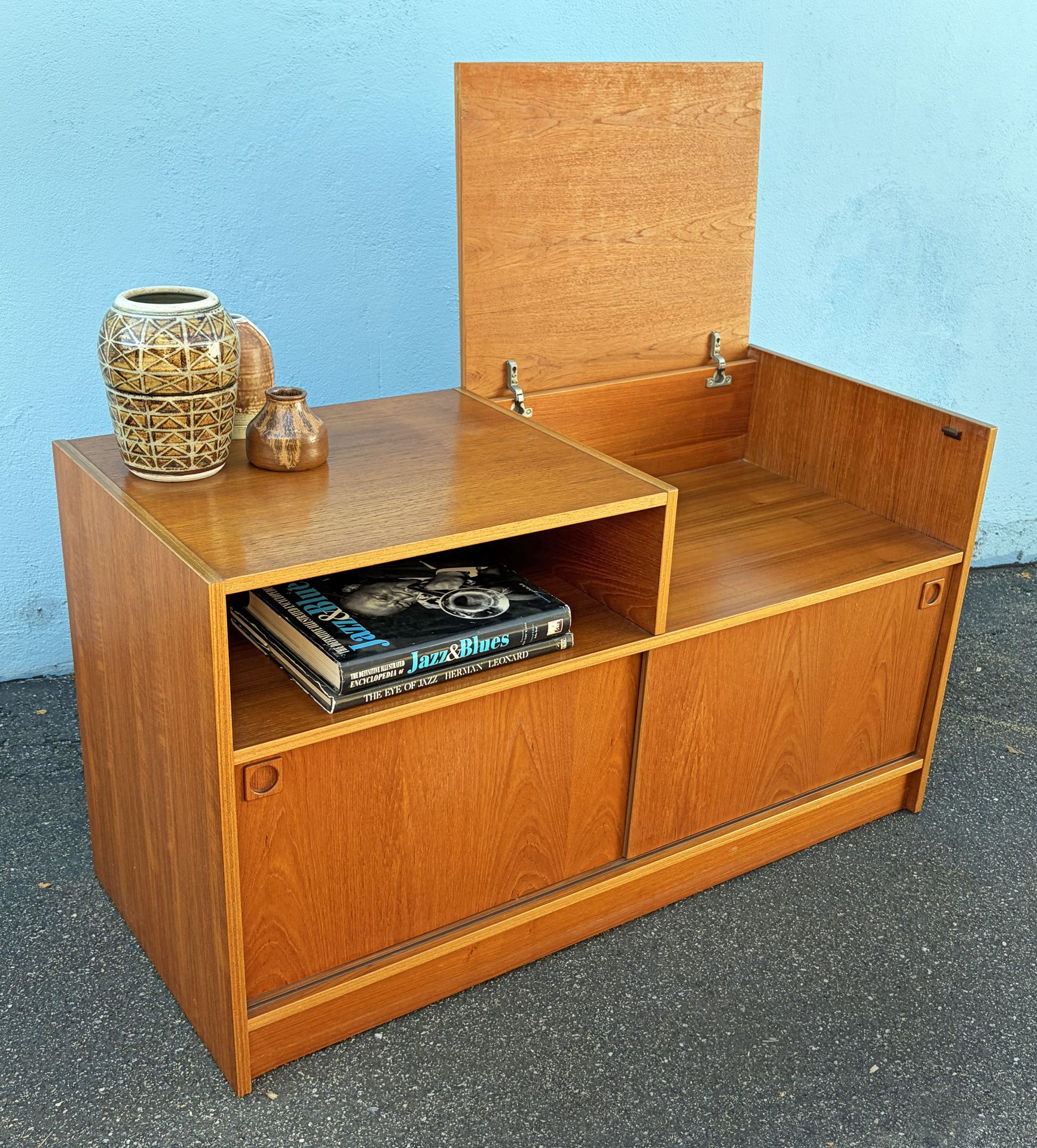 Vintage Danish Modern teak stereo/record cabinet. 20"X46.5"x26.75"h. Lift up top for a turntable. No chips or stains. Has a few minor scratches. Comes with holes for cords and record holders in the bottom cabinet. Stamped "Made in Denmark" on the inside. Classic Danish Modern!