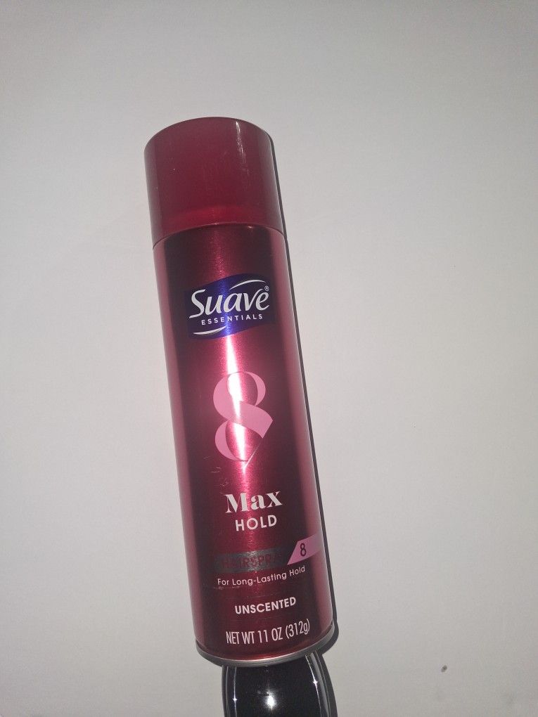 Suave Max Hold Hairspray. It provides long-lasting hold and control for all hair types. The formula is enriched with vitamins and proteins. It offers a natural-looking hold that is not stiff or sticky. The product helps give hair body, volume, and lift while keeping it frizz-free. Disclaimer: Hairspray is flammable.