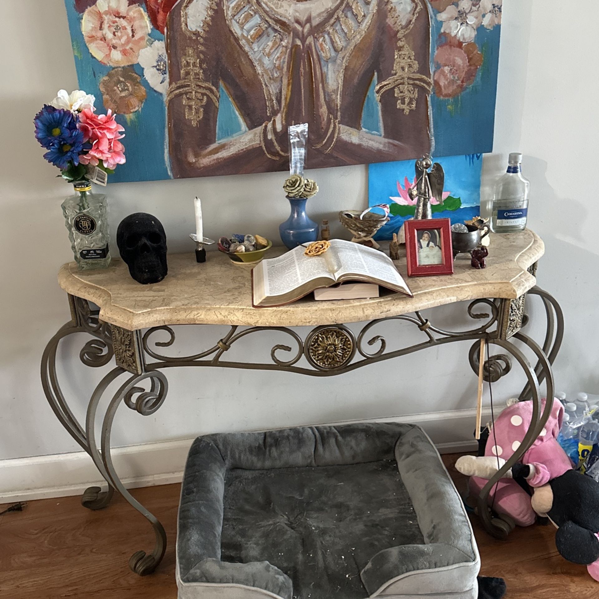 One of my favorite pieces. Beautiful end table or hallway table. Bronze stems and cream colored marble top. Very sturdy. About 75lbs