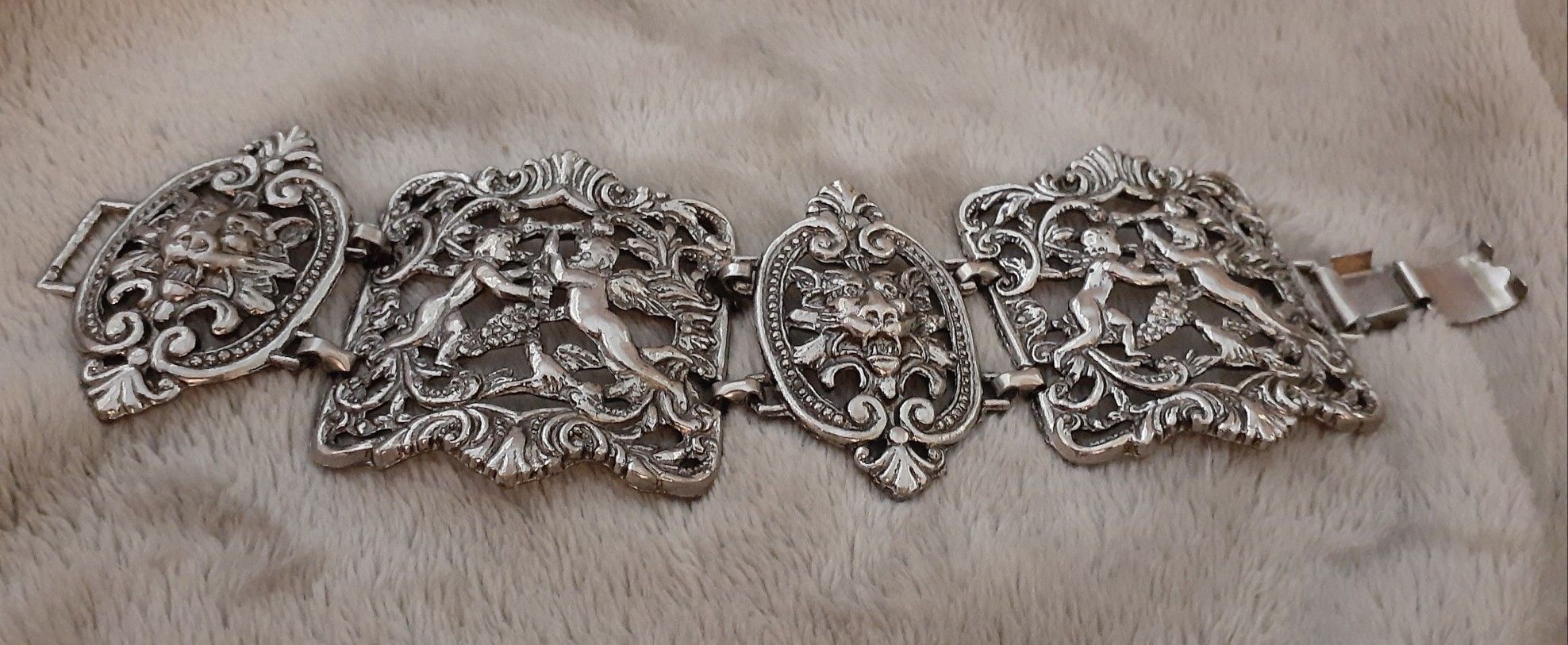 Vintage panel bracelet. Silver tone metal unsigned. Relief design cherubs and lions. Unmarked. Excellent conditon