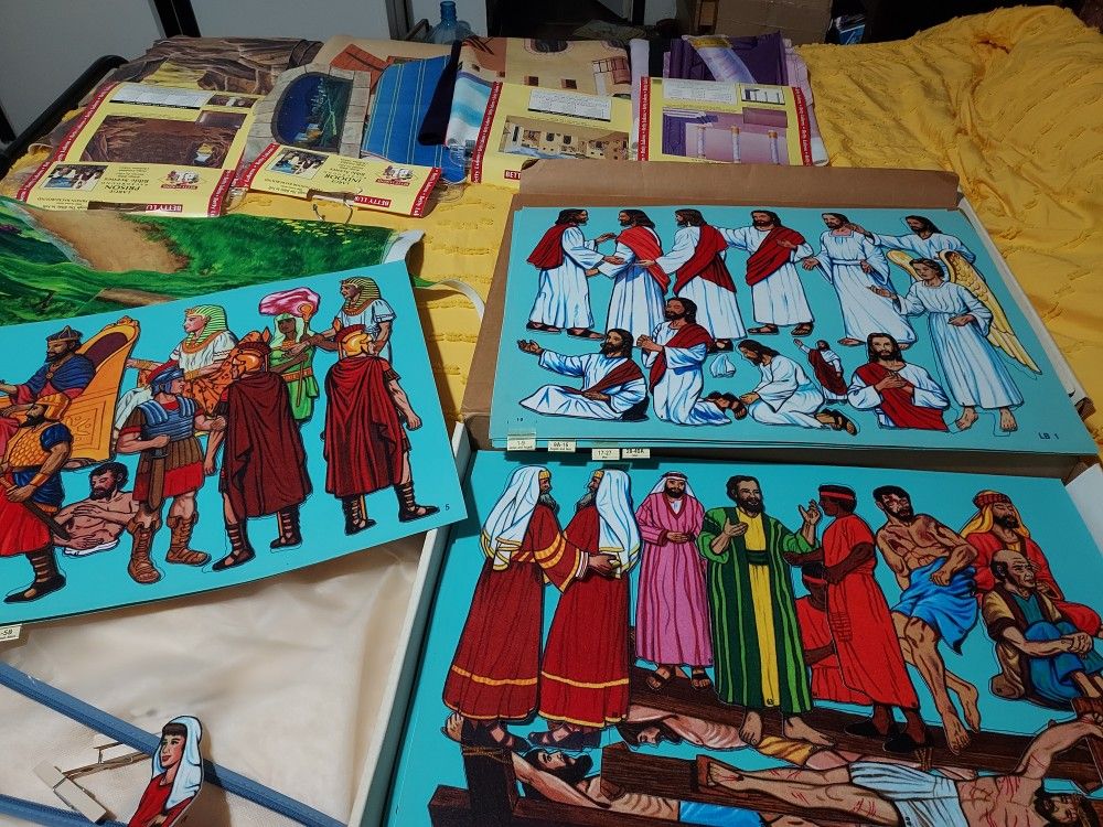 This is the large (32×48) deluxe set plus 4 extra overlay sets. The only thing missing is one piece that pictured 2 small cats. There are 1000s of pieces not just the figures that are pictured. The water scene was previously mounted on a board so it has creases and glue around the outside edges. This piece also shows the most wear with a few spots. They other backgrounds, overlays and pieces look about brand new. The boxes do show wear. This is a great deal for all you get and the best part is the pieces have already been cut out for you! This would be great for a church, a school or even just a family.