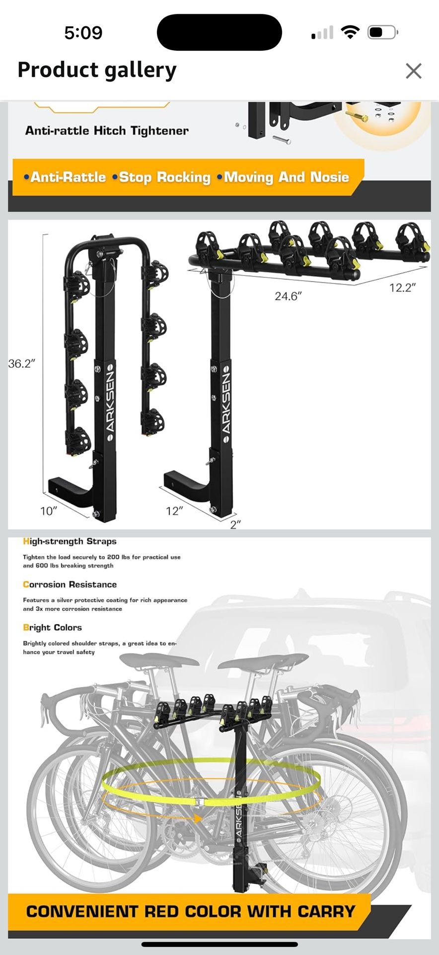 Brand new still in the box. ARKSEN 4 Bike Rack, Heavy Duty Bicycle Carrier, Rear Hitch Mount with 2" Receiver, Tie Down Strap and Anti-Rattle Hitch Tightener, for Car, Truck or SUV Transport.