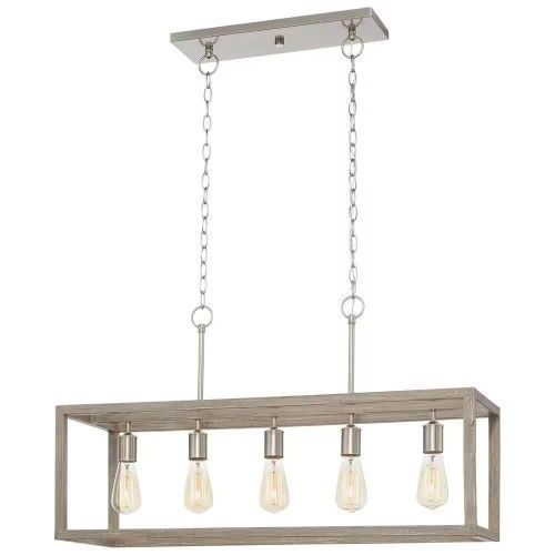 34" 5 Light Brushed Nickel Farmhouse Linear Chandelier w/Weathered Wood Accents