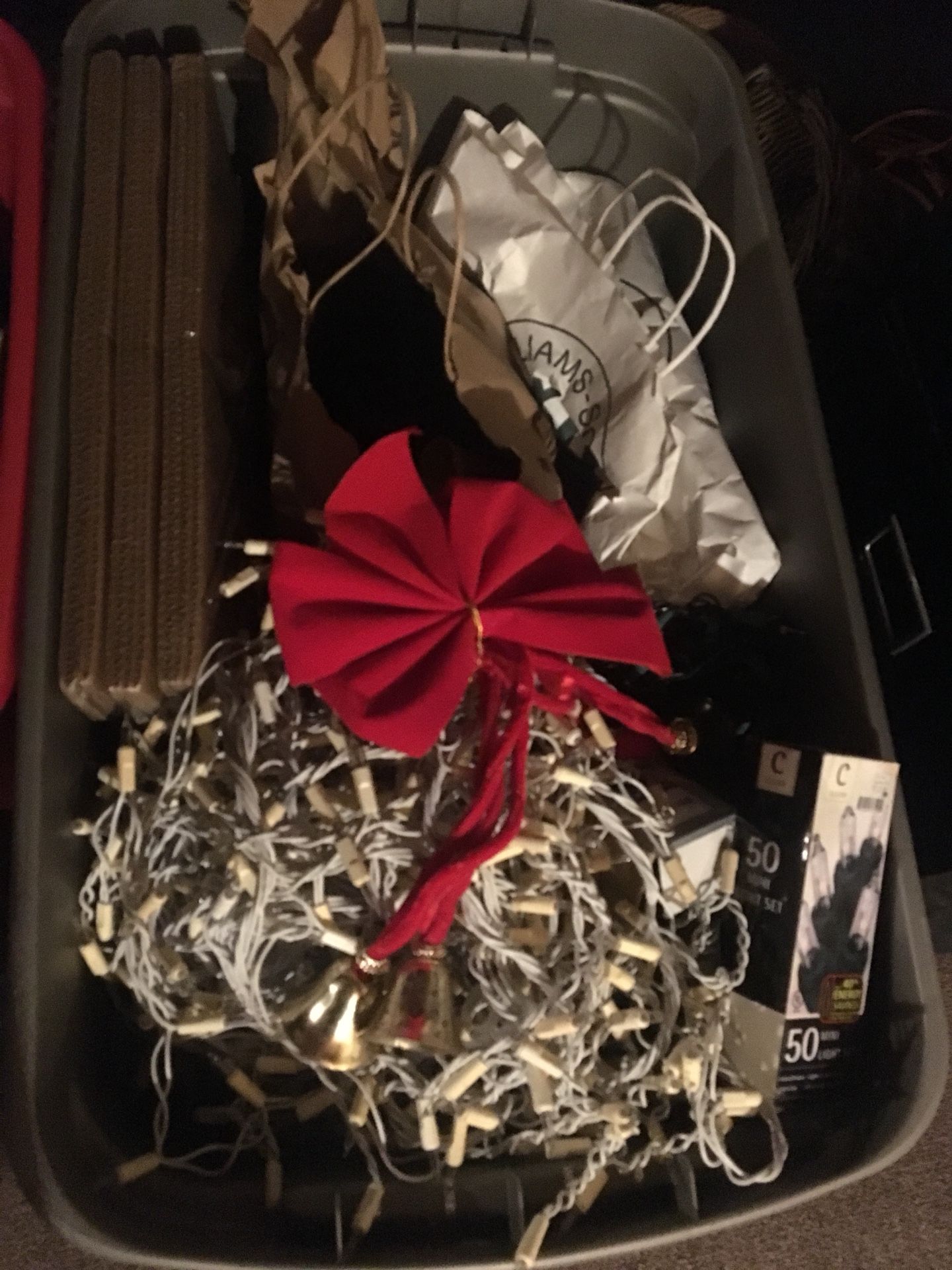 Large Christmas bin. Outdoor lights. Netting ornament organizers etc