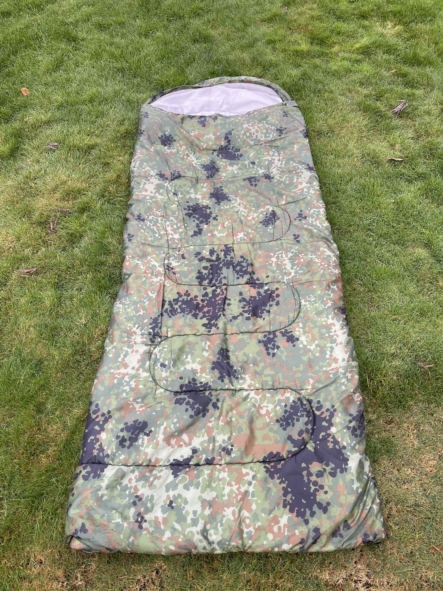 Adult Sleeping bag German Flecktarn pattern. Has 2 zippers which allows you to open it all the way up or just the side or bottom. It has the baffle at the neck to keep cold air from slipping in. There is a Velcro tab at the top to prevent accidental opening, includes a pocket for a wallet or phone. Includes black paracord tie straps. Approximately 84” foot to head, 32” wide at the shoulder. Price is firm, cash only, no electronic payment methods. Porch pick up is in Lakewood, Washington.