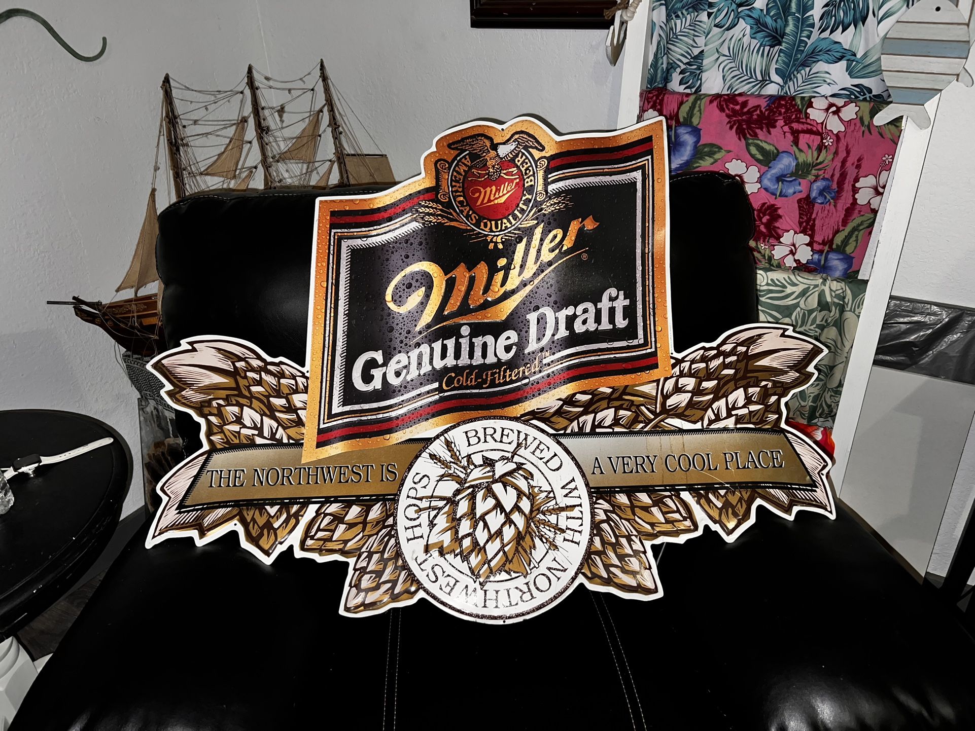 Miller genuine draft beer sign made out of metal it is 40 inches wide by 30 inches high