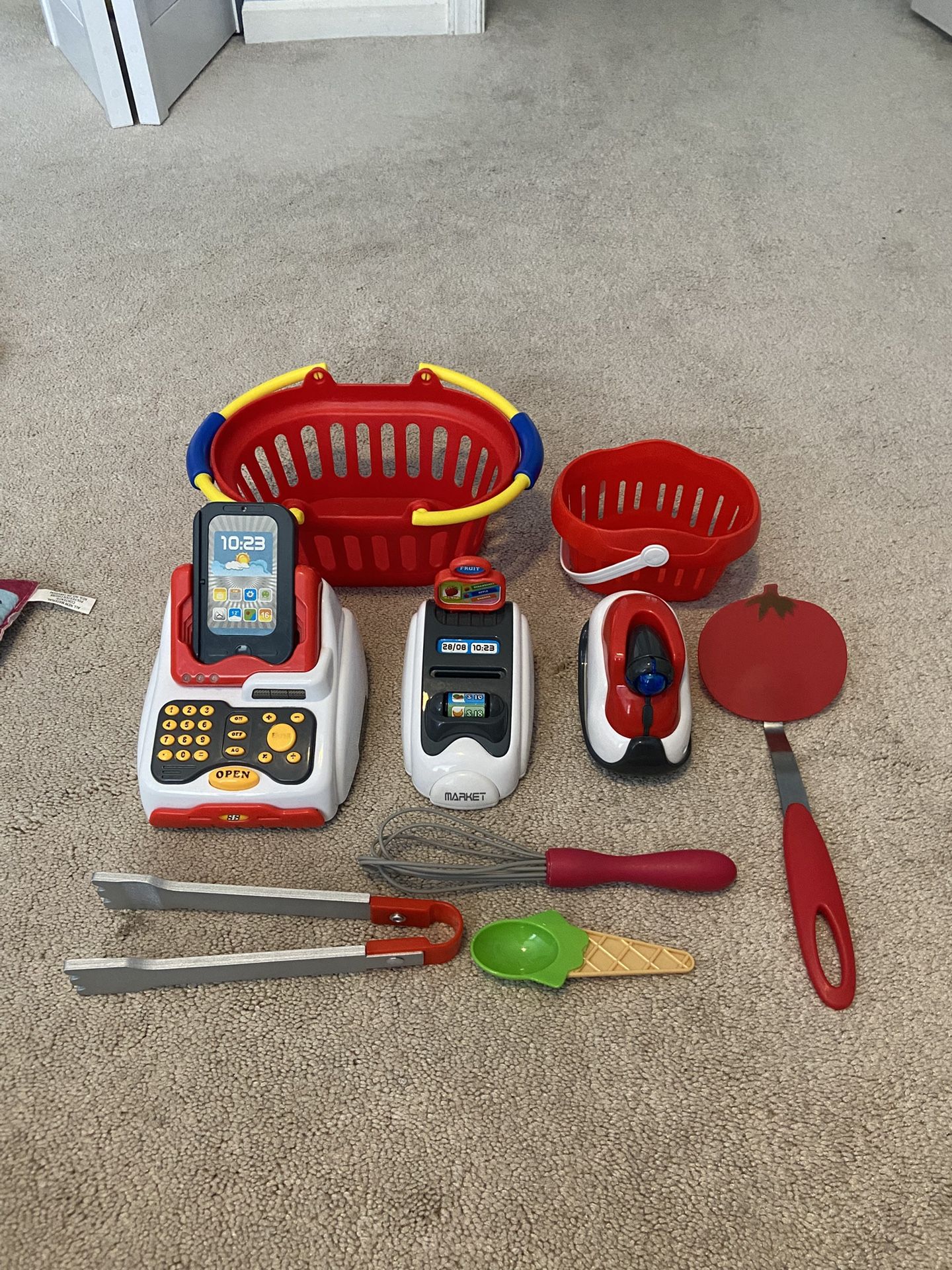 2 baskets, kitchen tools, cash register, fruit scale, phone, scanner