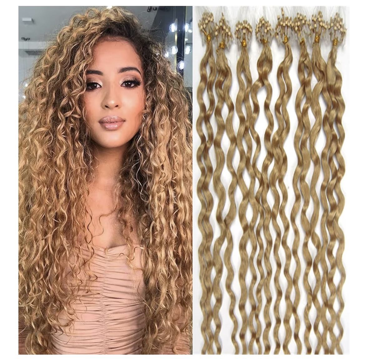 Micro Ring Link Hair Extensions Invisible Micro Ring Beads Loop Tip Remy Human Hair Curly Golden Blonde 20inch 100s