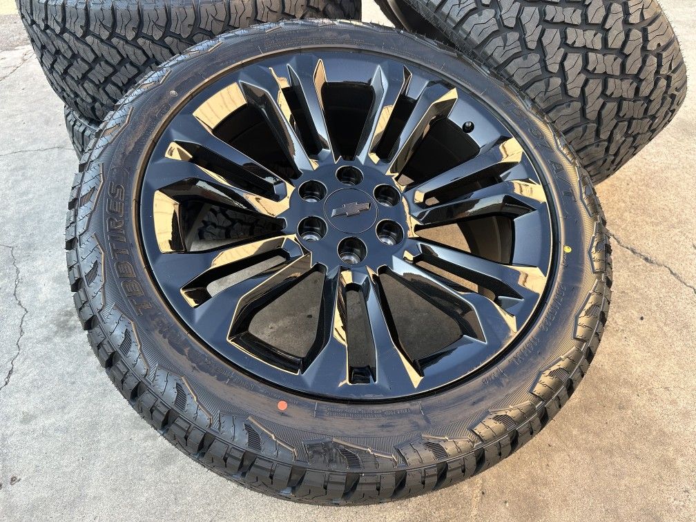 Brand new set of 22" wheels with 285/45R22 all-terrain tires. Wheels and tires come Mounted and Balanced with full manufacturers warranty! Installation available! Wheel size is 22x9 with offset 24 and 6x5.5 bolt pattern. $1,350+TAX Cash/Debit or Credit Card+3% accepted! Financing available. Wheels fit: •Chevy Tahoe, Silverado 1500, Avalanche, Suburban •GMC Sierra, Yukon •Cadillac Escalade