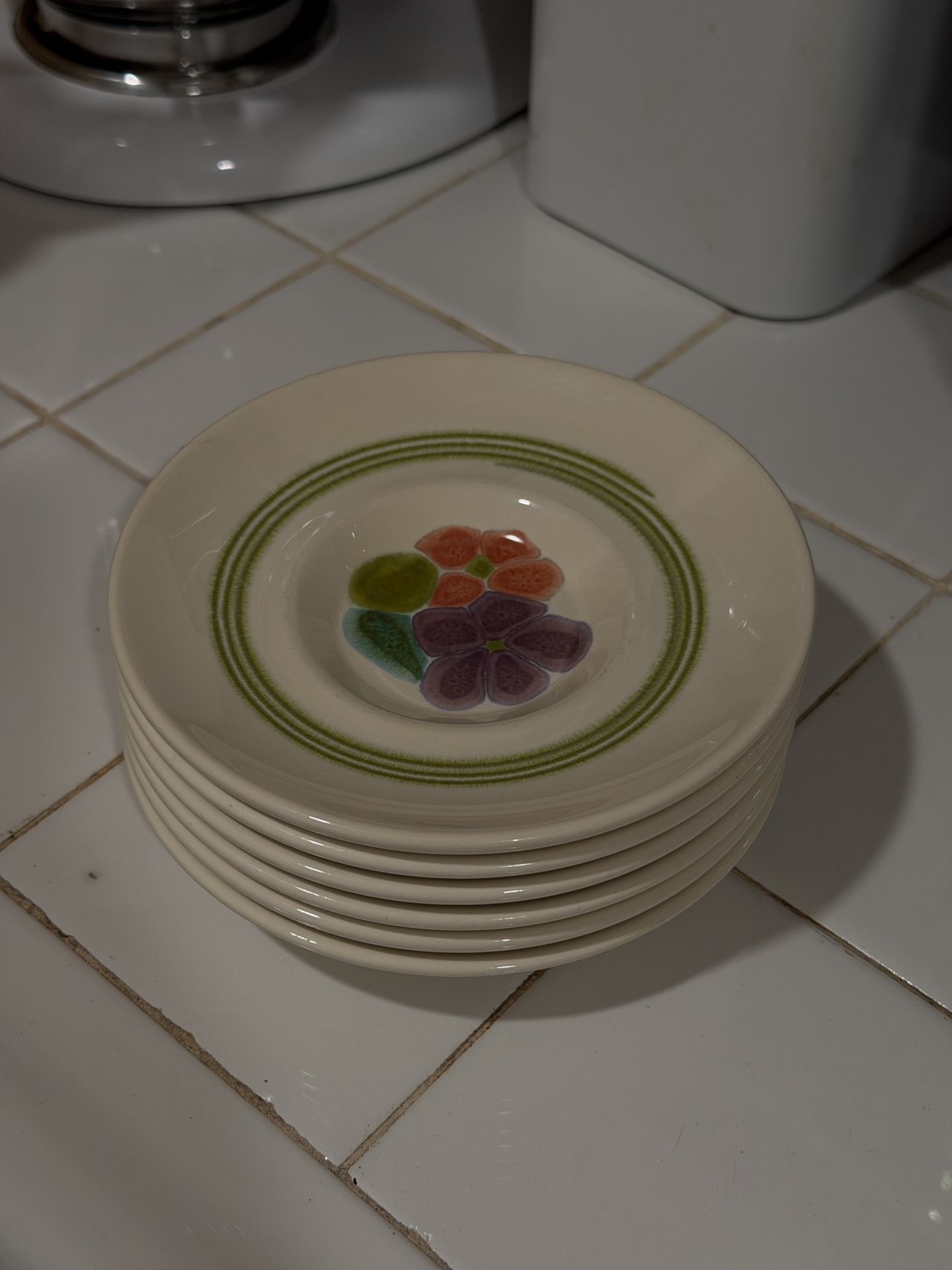 vintage ceramic dessert bowls featuring a colorful retro flower motif and double green ring border. Great for serving snacks, fruit, or ice cream. All pieces are in good vintage condition with no cracks and only light wear consistent with age. Set of 6.