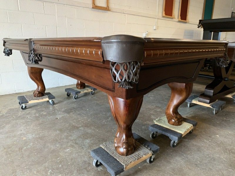 **7 foot or 8 foot** This table is solid maple with a dark brown finish. This is a beautiful Savannah Pool Table. It has 1" inch slate, drop leather pockets with shields, ball-in-claw legs, and we will recover it with new Championship felt (your choice of color).