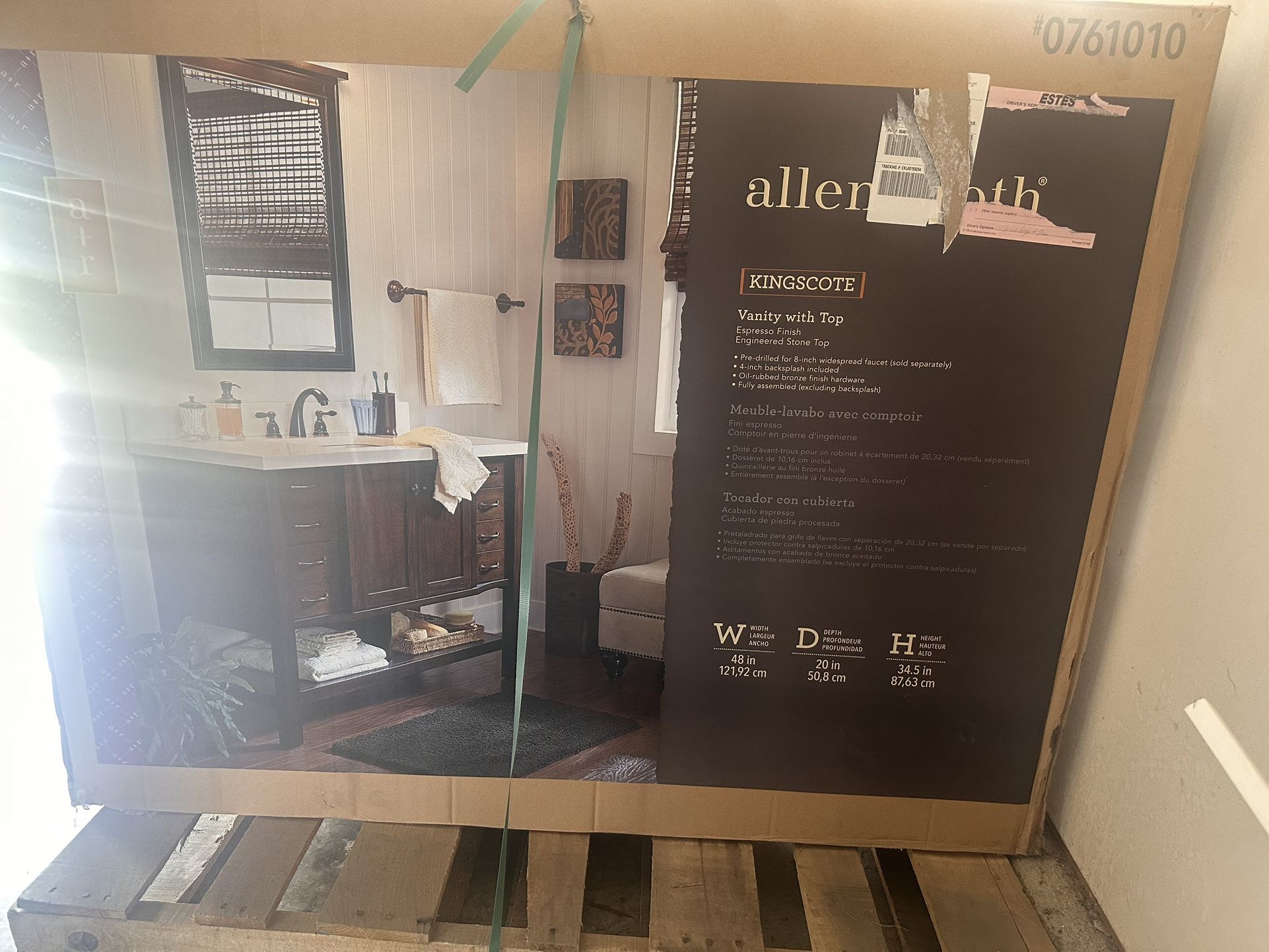 Complete your bathroom with this both stylish and functional vanity by allen + roth. This vanity with two doors, four pull out drawers and open bottom shelf provides ample storage for all your essentials. • Traditional style vanity constructed of solid hardwood and wood veneer • Durable white engineered stone top and 4-inch optional backsplash included • Full width lower storage shelf, ideal for towels • Rectangular and practical white ceramic under-mount sink is pre-attached to vanity top • Decorative oil-rubbed bronze drawer and cabinet hardware included • 4 drawers and 2 doors provide ample storage space • Overall Dimensions: 48in W x 20in D x 34.5in H (The backsplash included with the vanity will add an additional 4 inches of height) • The ideal vanity for a bathroom update or remodel MSRP:$699 asking $400