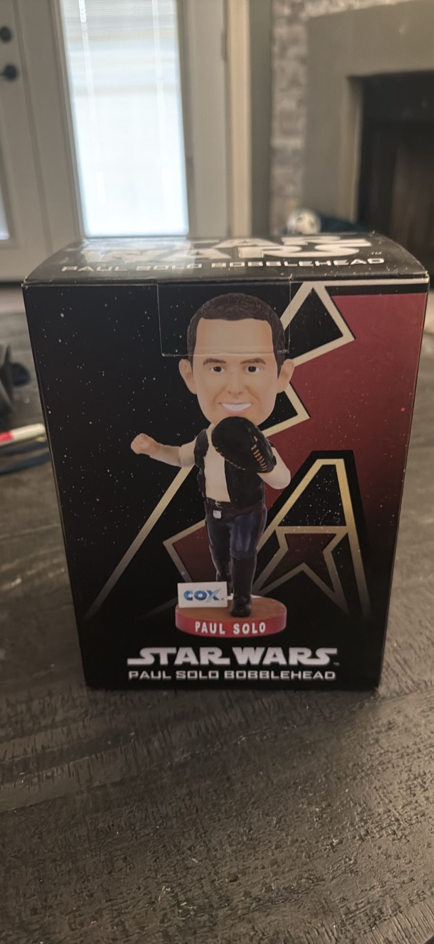 Calling all D-backs and Star Wars fans! This is the limited edition 2018 Stadium Giveaway (SGA) featuring Paul Goldschmidt as Han Solo ("Paul Solo"). This collectible was a promotional item courtesy of Cox Communications and is a must-have for any Diamondbacks or Star Wars memorabilia collection. • Player: Paul Goldschmidt (#44) • Theme: Star Wars / Han Solo • Condition: Like New/New in Box (Box shows very minor shelf wear, bobblehead is mint). • Team: Arizona Diamondbacks • Features: High-quality detail, featuring Goldy in the iconic Han Solo vest and holster. Perfect for a desk, man cave, or trophy shelf. I’m looking for $15 OBO send me a message let’s talk!