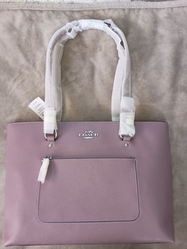 Coach Station Tote Bag. This specific color is referred to as Jasmine or Jasmine Purple. Material: Crafted from durable cross grain leather with a fabric lining. Design: Features a zip-top closure and handles with a 10.5-inch drop for comfortable shoulder wear. Pockets: Includes one outside zip pocket on the front, plus interior zip, cell phone, and multifunction pockets. Dimensions: Approximately 13.75" (L) x 10.25" (H) x 5.0" (W). Authentic Accepting offers