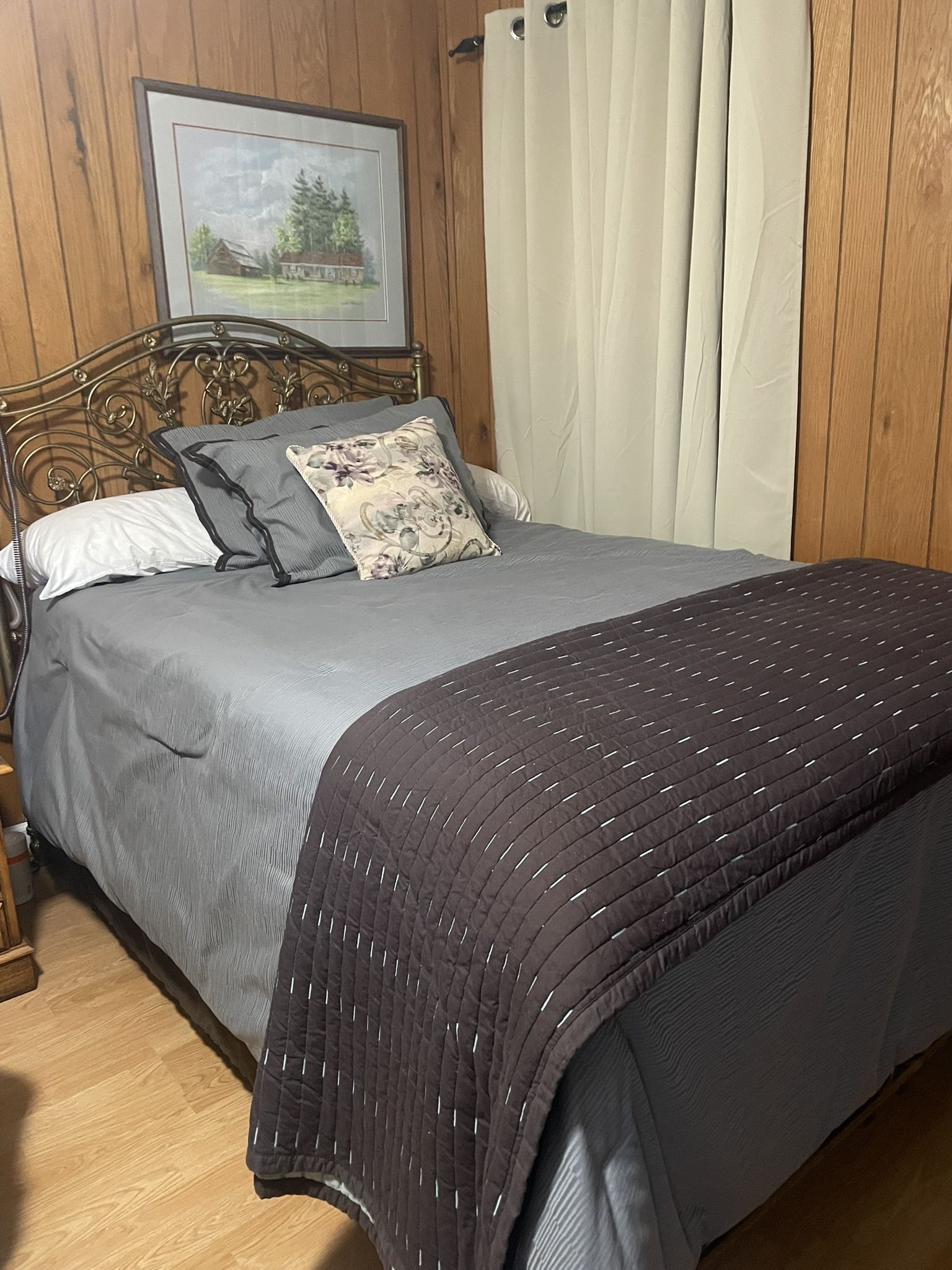 Bed has Heavy, Sturdy well made headboard, and footboard. Very comfortable and well-maintained frame and mattress. Victorian style. Barely used…No wear or tear AT ALL… Just time to downsize.