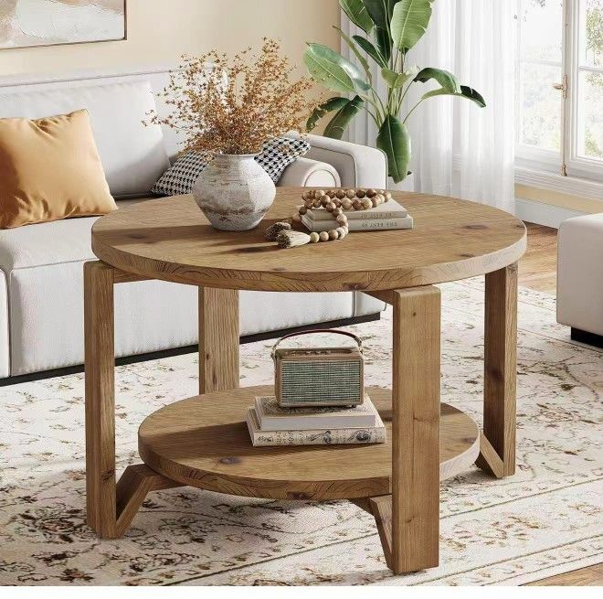 WW0012 30" Solid Wood Coffee Table, Round Small Coffee Table with 2-Tier Storage for Living Room, Farmhouse Circle Center Accent, Brown Round Solid Wo