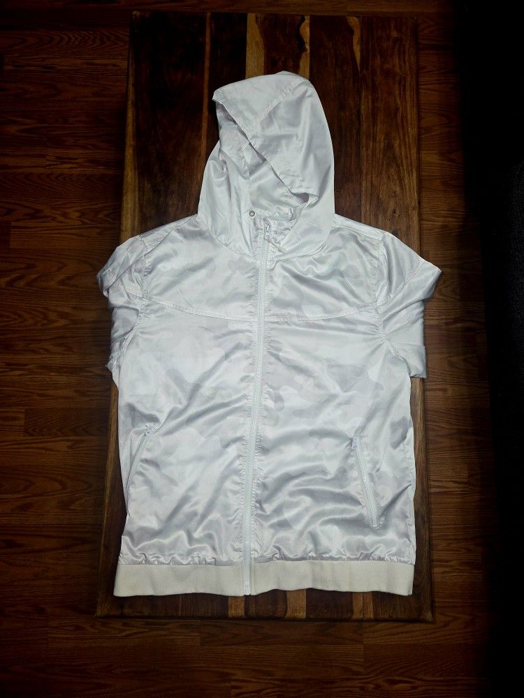Stylish White and Gray Camouflage Hooded Jacket with a zip-up front, 2 side zipper pockets and Cream colored fabric on the ends. Size XL and is Brand New/Never Worn!