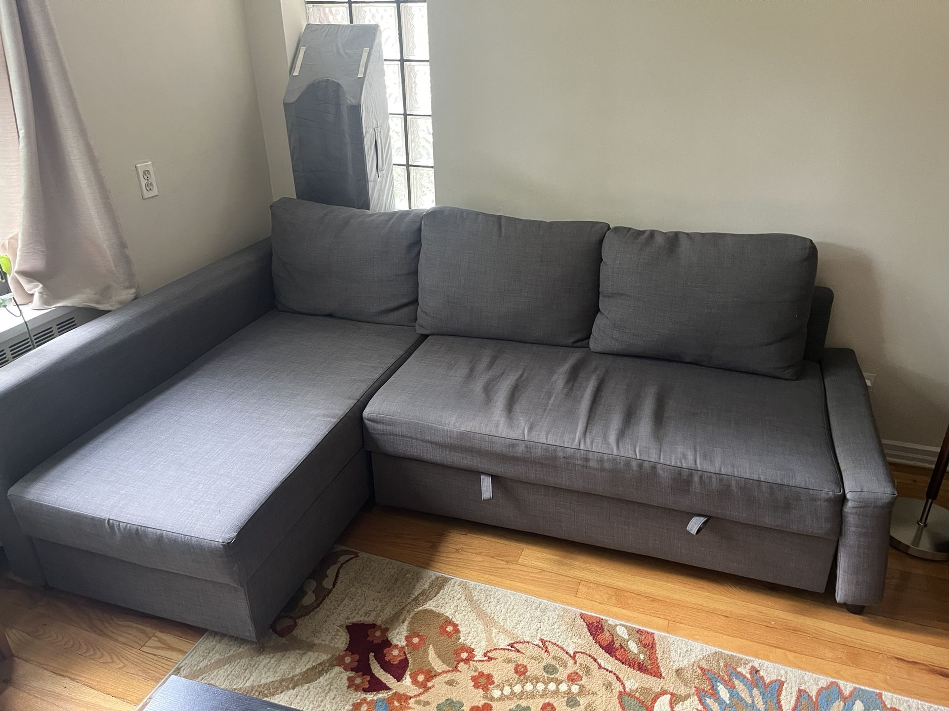 IKEA Friheten, 6 years old. Has storage under the chaise section and pulls out to convert into a bed. Some stains, one leg at an angle. Available for pick up 6/23-6/29