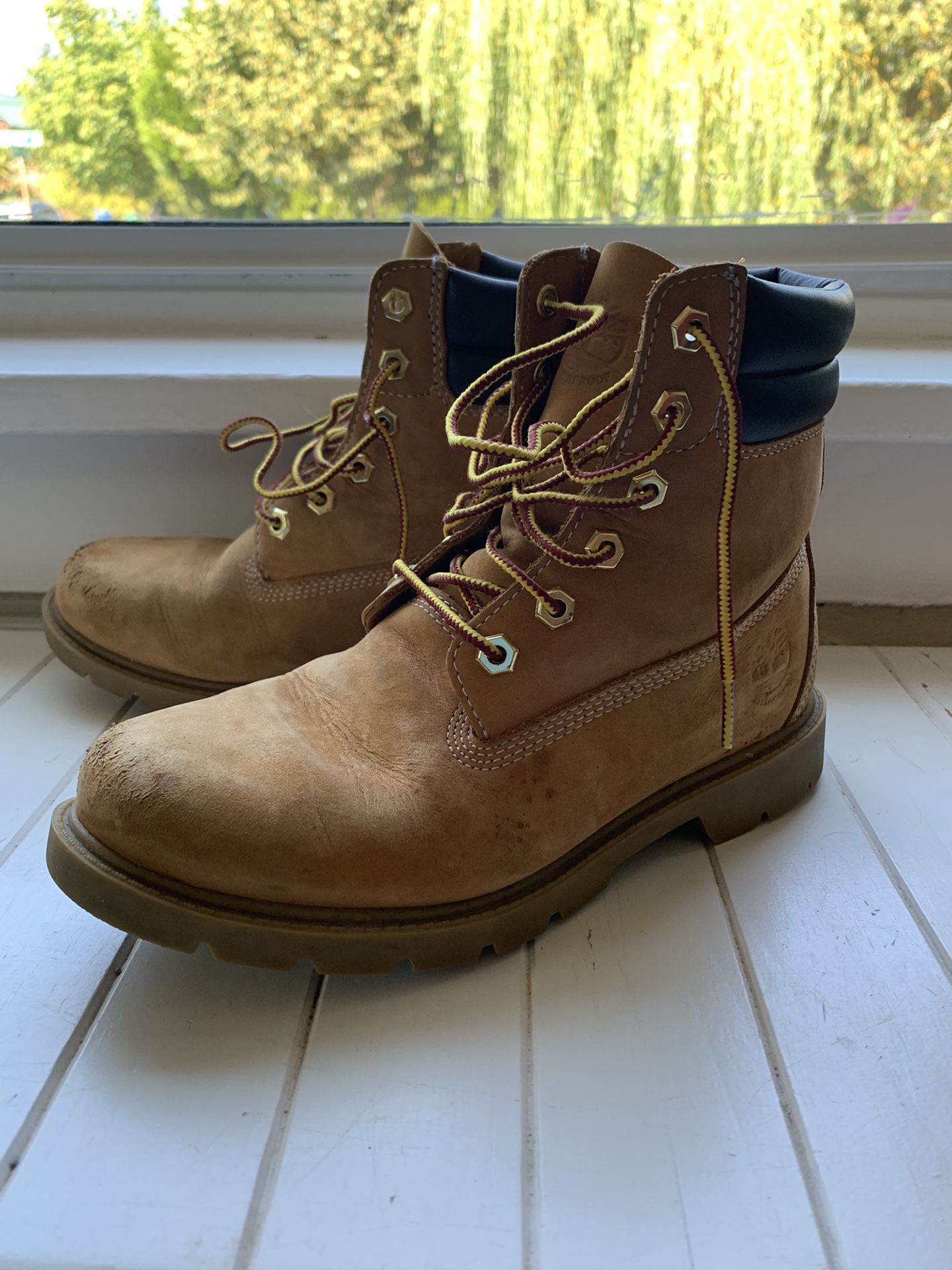 Great pair of classic Timberlands in wheat color. Worn less than 10 times. Bought these in NYC and they’re comfy and ready to wear. Great for autumn and all seasons. Lots of wear left. Women’s size US 7, UK size 5. Open to negotiating price! Pick up in First Hill/Cap Hill area.