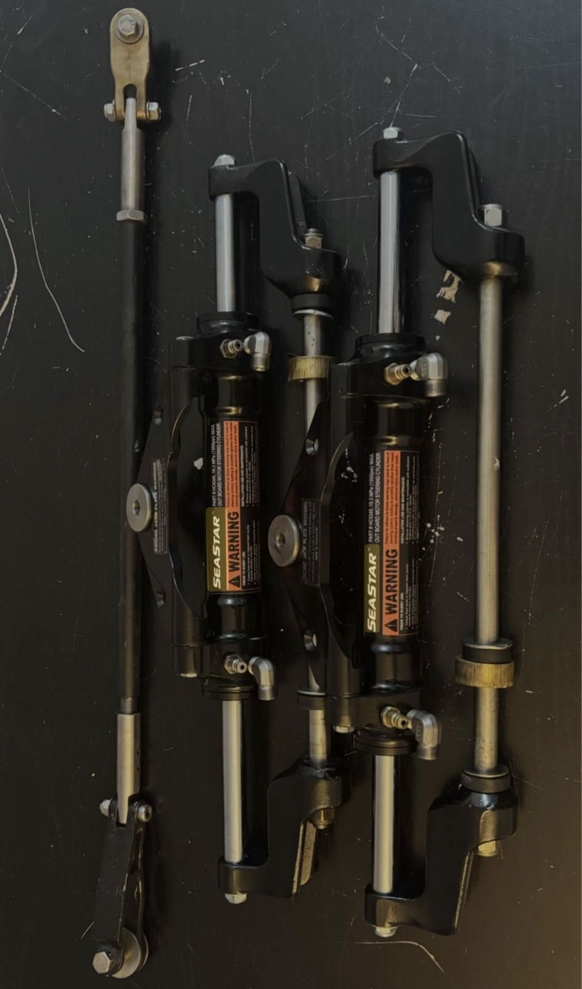 Dometic SeaStar Outboard Cylinder Dual Hydraulic Ram Setup Both Rams are almost New Tie bar is included with purchase Each cylinder has been completely disassembled, cleaned and reusable hard parts are inspected to insure they are within factory specifications. Seals, gaskets, O-rings, pistons and other parts have been replaced as required. Each cylinder is fully pressure tested to be sure it meets factory specifications prior to shipping. Yamaha , Mercury , Suzuki , Johnson, Evinrude, Honda
