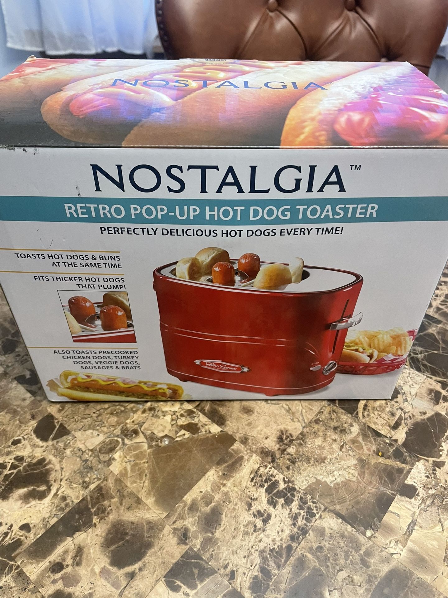 Brand new box never opened! $15.00 Get ready to enjoy perfectly delicious hot dogs every time with this Nostalgia Retro Pop-Up Hot Dog Toaster! It toasts both hot dogs and buns at the same time. It fits thicker hot dogs that plump and also toasts precooked chicken sausages and brats. Also features adjustable cooking time and stop cooking functions and includes mini tongs for easy hot dog removal