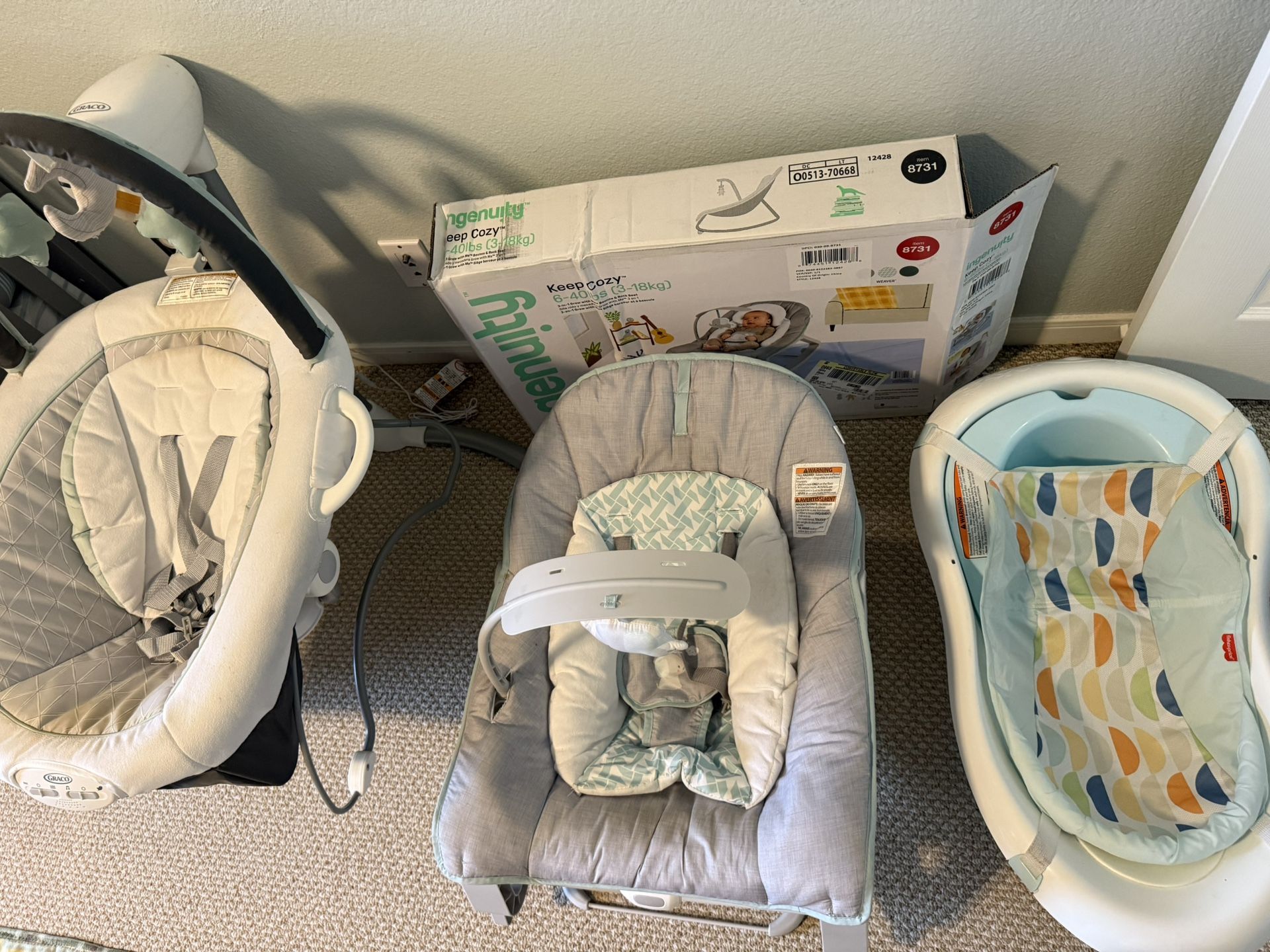 All barely used. Only minor stains that can be easily washed. Take All for $150. Or each Swing by graco: $99 Bouncer by ingenuity: $30 Bath tub by fisher price : $30 Serious buyers only.