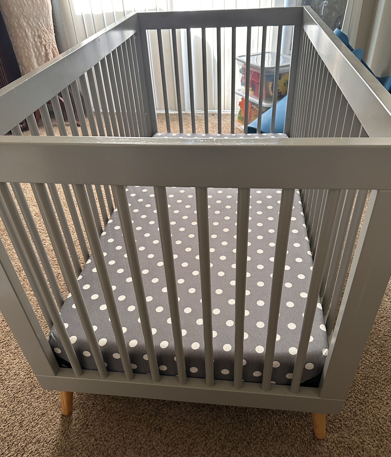 Grey Delta baby crib. Condition is good with slight paint chipping in one area as pictured. We are upgrading our son into a big boy bed and no longer need a crib. The mattress will be included if you would like. It has a washable waterproof cover on it that unzips easily.