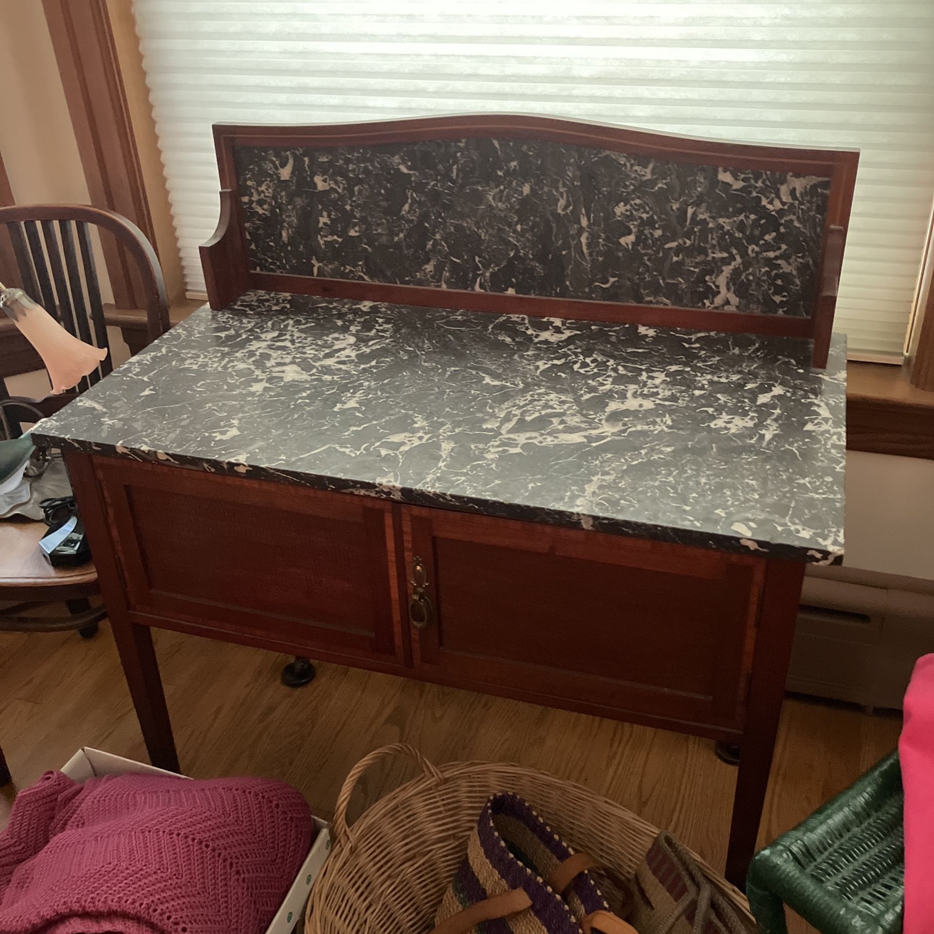 Marble topped. Dimensions are 20 in by 36. And 29 high on wheels